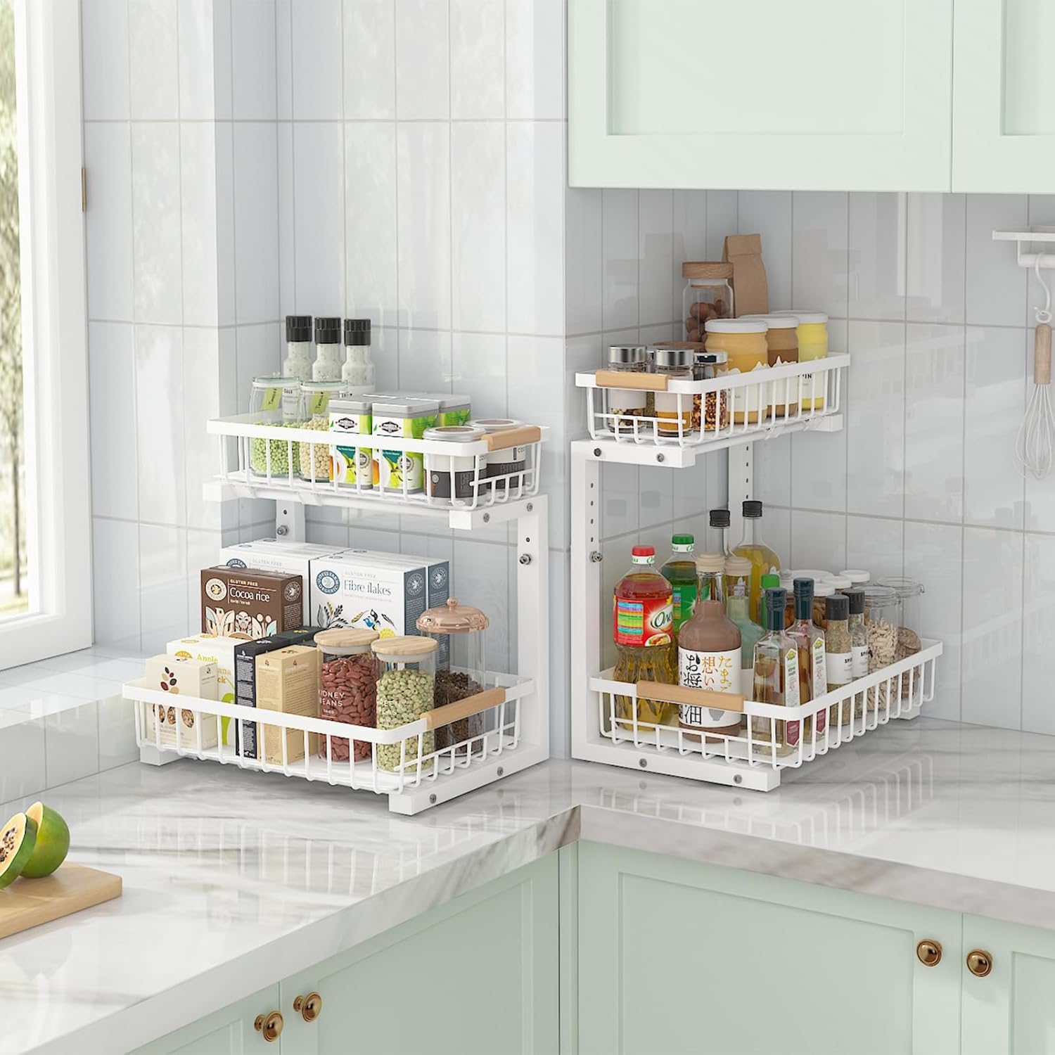 2-Tier pull out kitchen organizers and storage, good helper for home storage!