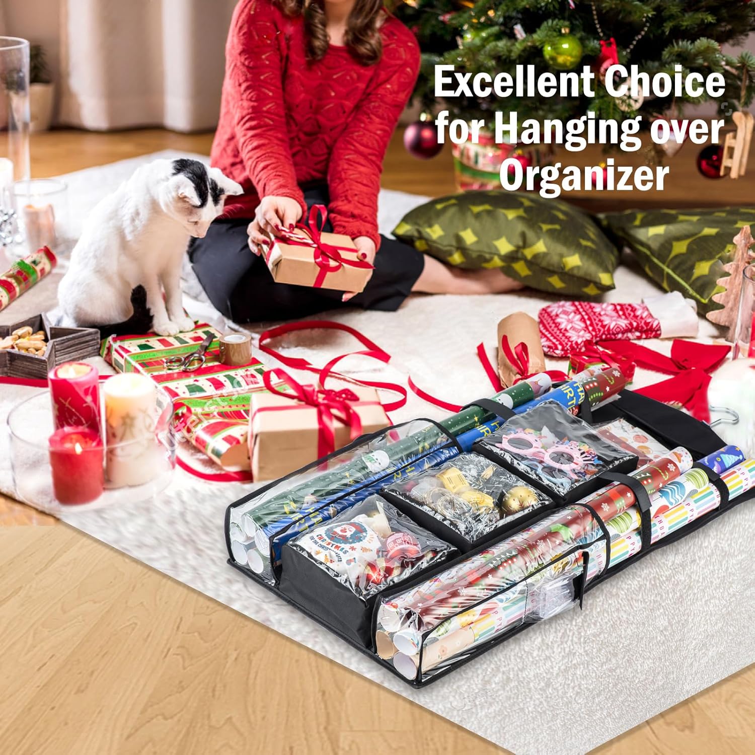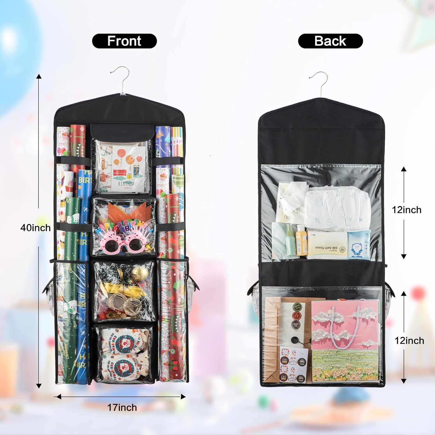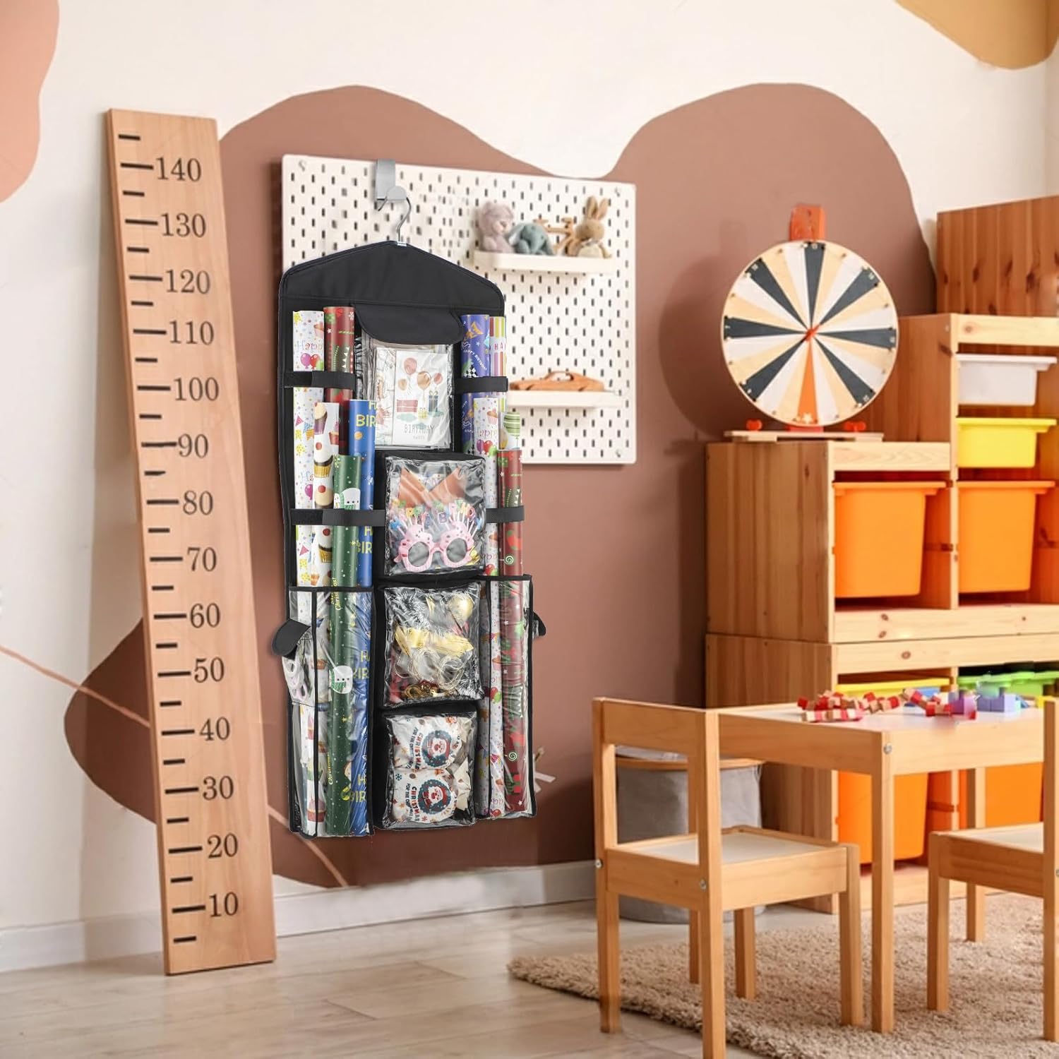 🎁 GIFT WRAP STORAGE ORGANIZER: EOLIMEX double-sided Gift Wrap Storage Organizer features 7 clear slots on the front and 2 large PVC pockets on the back. It’s the perfect Christmas wrapping paper organizer for your kitchen or room, offering a convenient hanging over-the-door design. The premium Velcro straps and zippers ensure your items stay in place and are easily accessible.