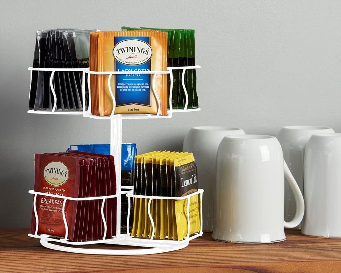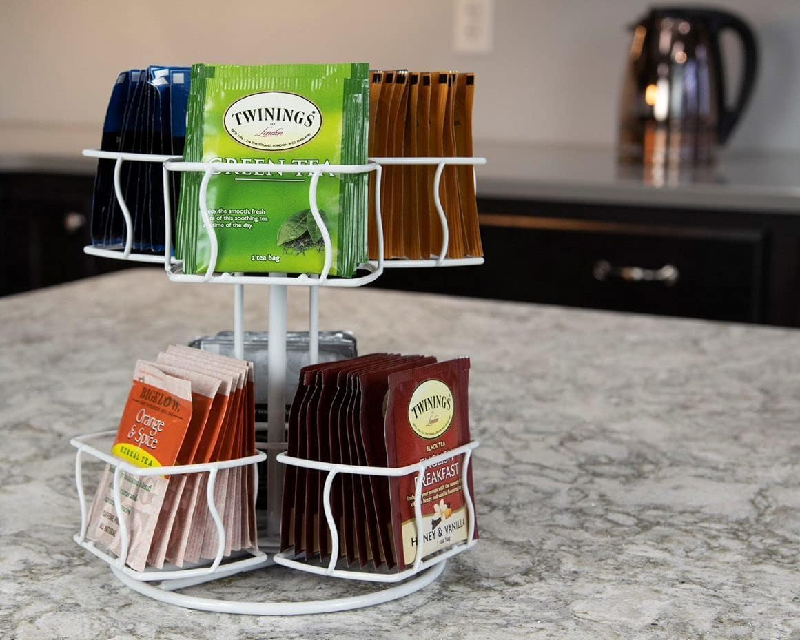 MODERN DESIGN: The modern, white finish style looks fantastic on the countertop in the kitchen, your dorm room, or in the office coffee bar. Even the heaviest tea drinkers will want this carousel to easily grab a packet and go.