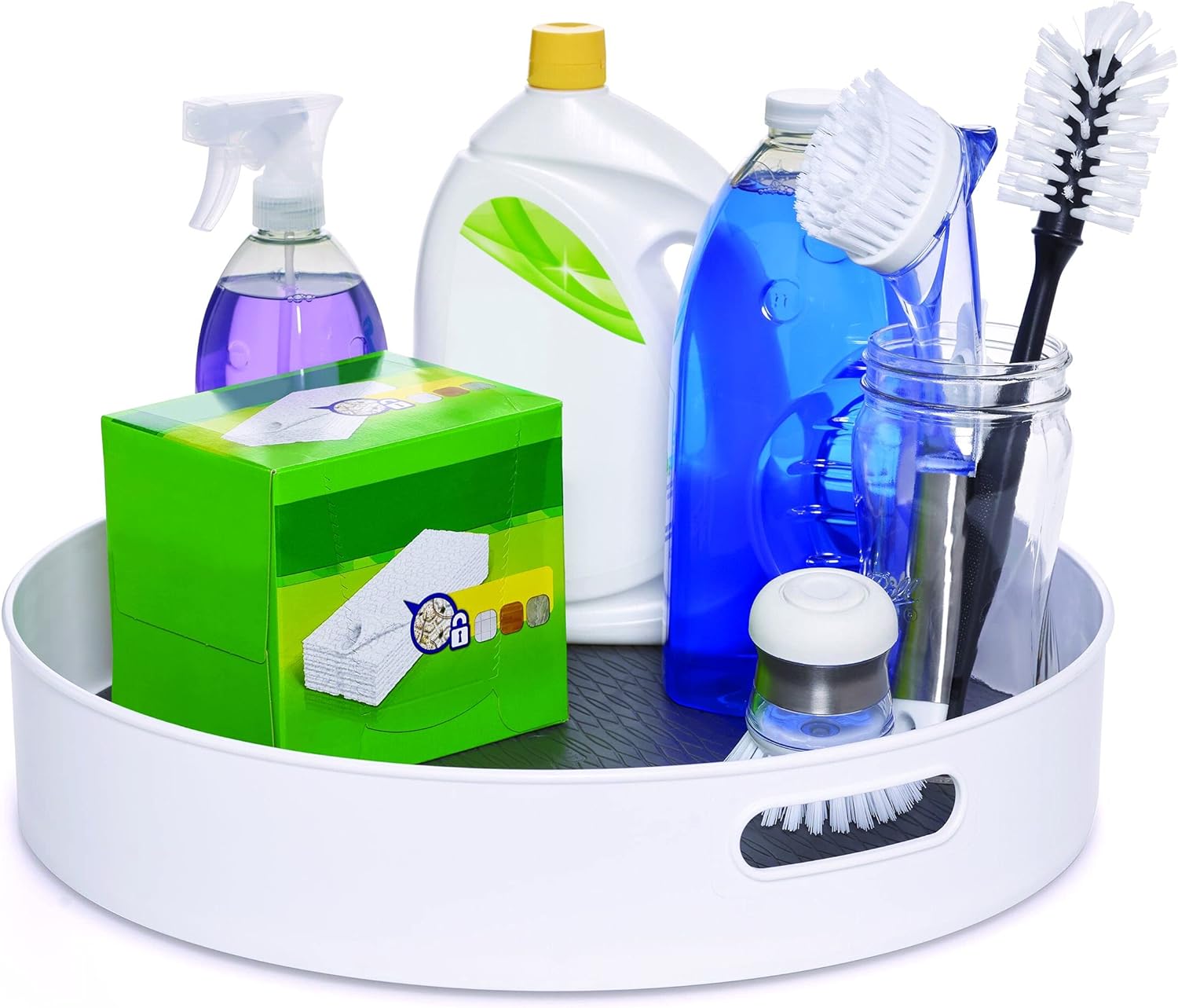 Customers find the lazy Susan turntable works well, particularly under sinks, and appreciate its smooth glide rotation. The product fits perfectly in corner cabinets and deep pantry shelves, while being sturdy enough to hold items securely. Customers praise its storage capacity, with one mentioning it can hold 4 large paper towel rolls, and its accessibility features, with one noting how easy it is to browse spice jars. They value its organization capabilities, particularly for cleaning supplies and spices.