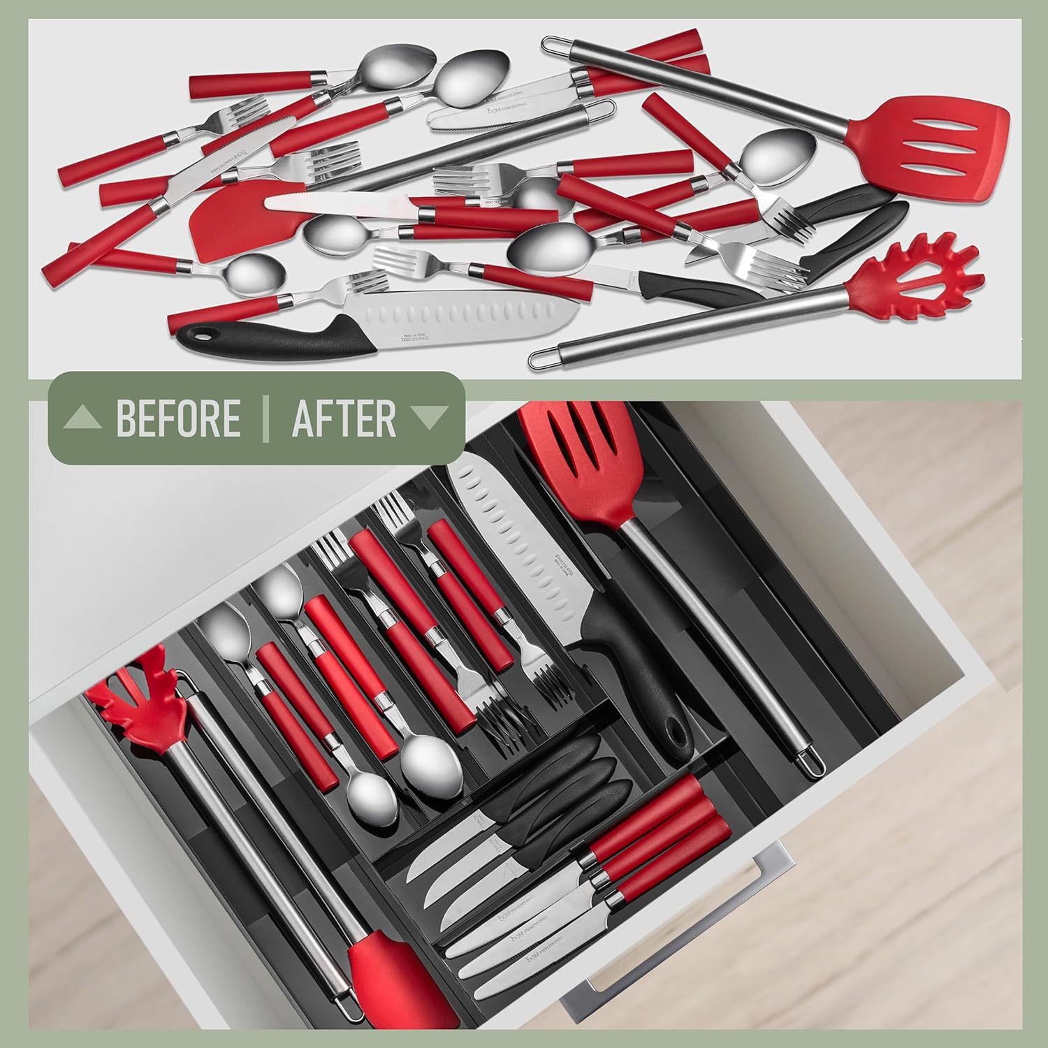Versatile Use: This utensil drawer organizer has plenty of space to organize a variety of flatware including spoons, knives, forks, spatulas, whisks, tongs, ladles, scissors, and more. Use as a cutlery drawer organizer, kitchen utensil organizer, flatware organizer for drawer, silverware tray, spoon organizer, utensil tray, and more.