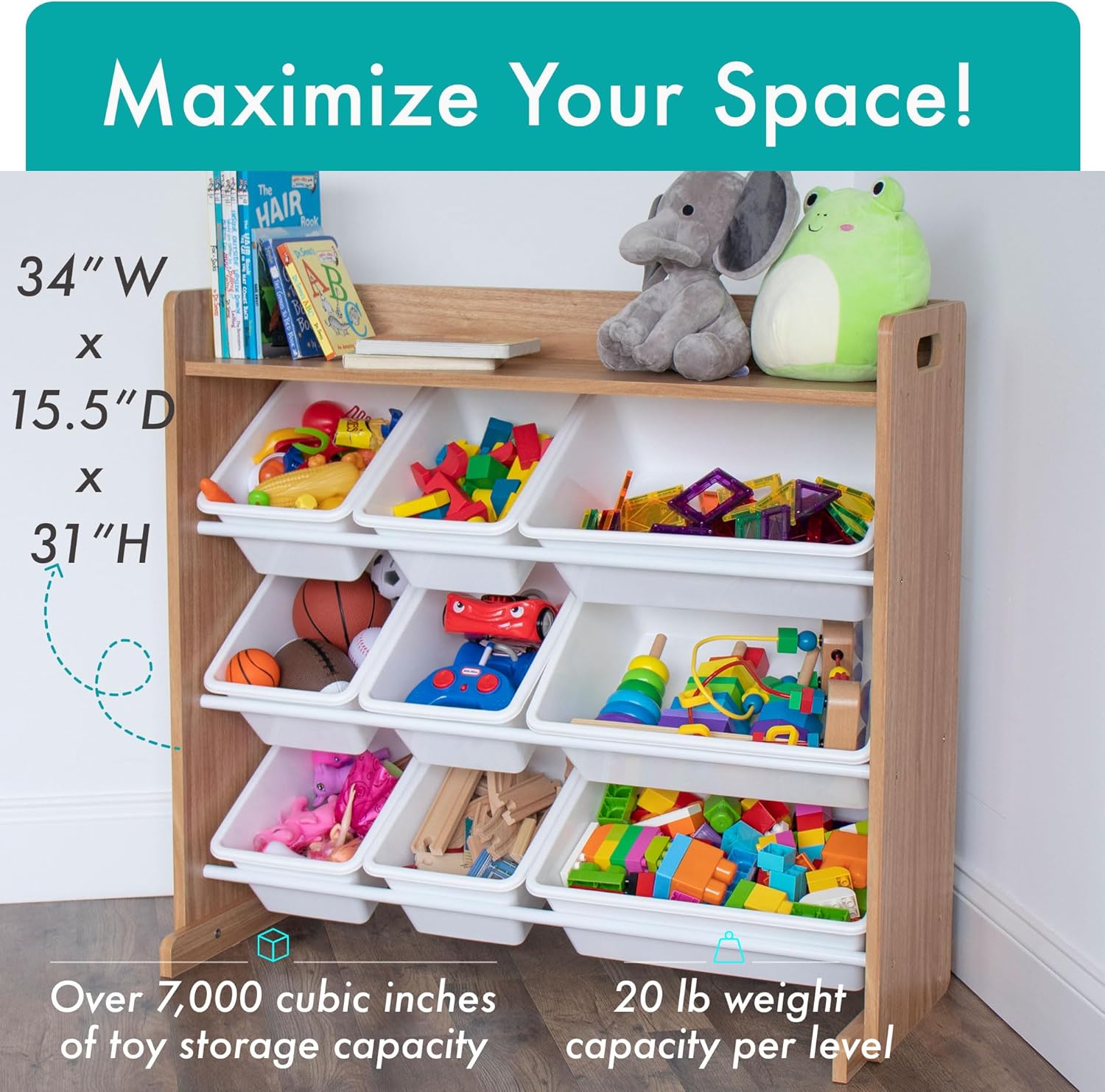 Removable Toy Storage Bins: Includes 9 durable and interchangeable bins (6 standard, 3 large) for effortless organization and clean-up, making it an ideal toy storage organizer and children’s toy storage solution for busy playrooms and nurseries.