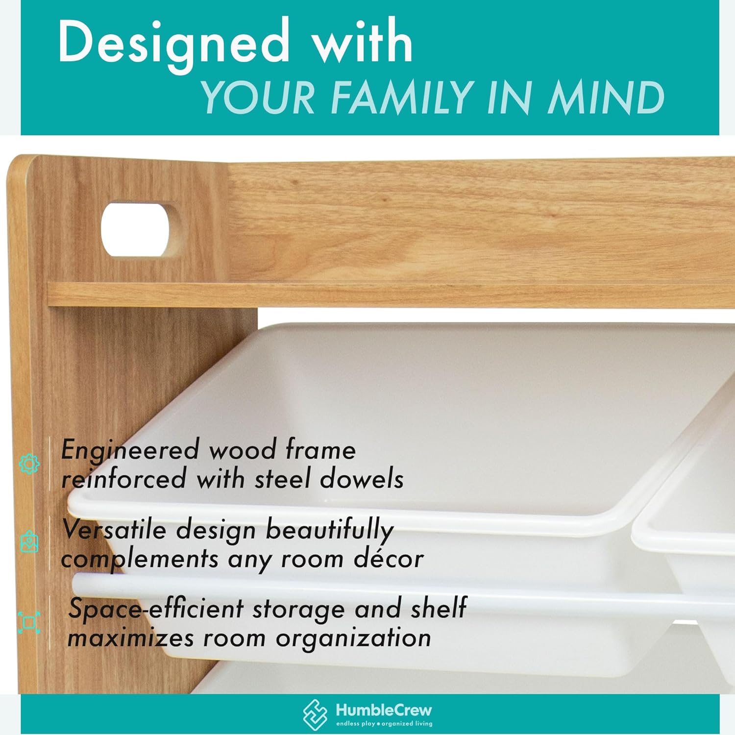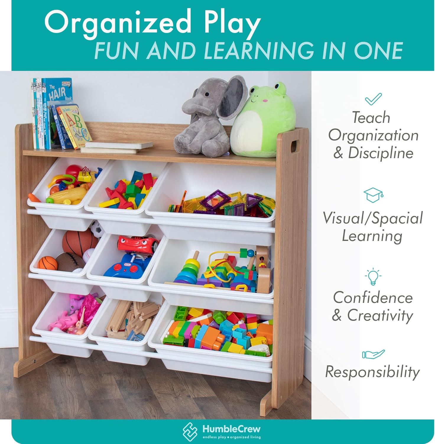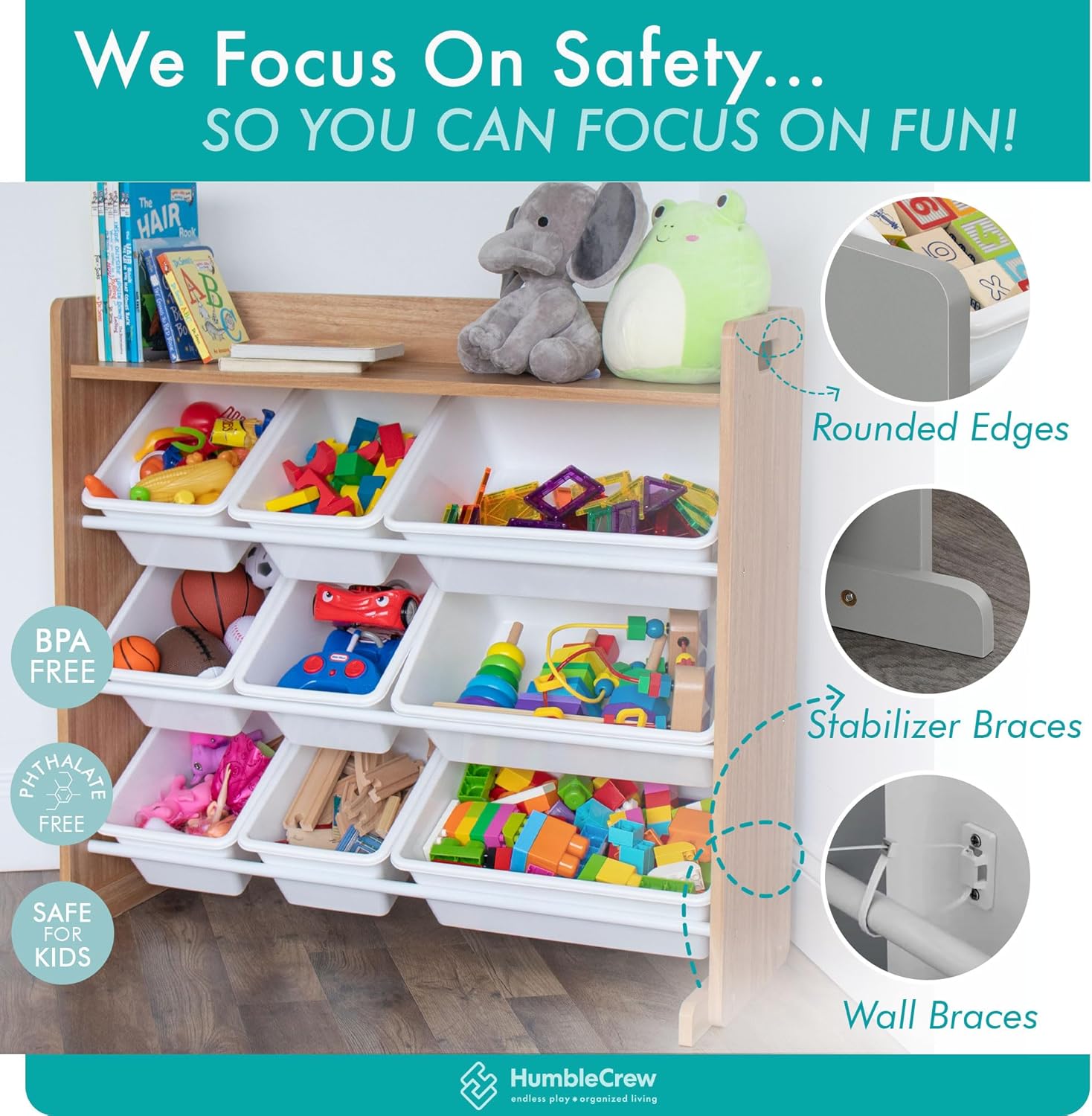 Enhance your child’s space with the Humble Crew Toy Storage Organizer with Shelf and 9 Storage Bins. This versatile toy storage organizer features 6 standard and 3 large bins, making it an ideal solution for toddler toy storage, baby toy organizer, and more. Its thoughtful design ensures that toys, books, and games are organized and accessible, promoting a tidy environment. The three-tiered shelves and top ledge offer abundant storage options, perfect for organizing a variety of items. Whether used as a toy shelf organizer with bins or a bookshelf and toy storage unit, this organizer adapts to your child’s needs. The bins are removable, allowing for easy clean-up and reorganization, making it a top choice for any kids’ toy organizer needs. Constructed with a durable engineered wood frame and reinforced with steel shelving rods, this toy organizer is designed to last. It supports up to 20 pounds per level, making it a reliable and sturdy addition to your child’s room. The sleek natural finish and neutral design blend seamlessly with any decor, while safety features like stabilizing braces and a wall anchor anti-tip kit ensure peace of mind.