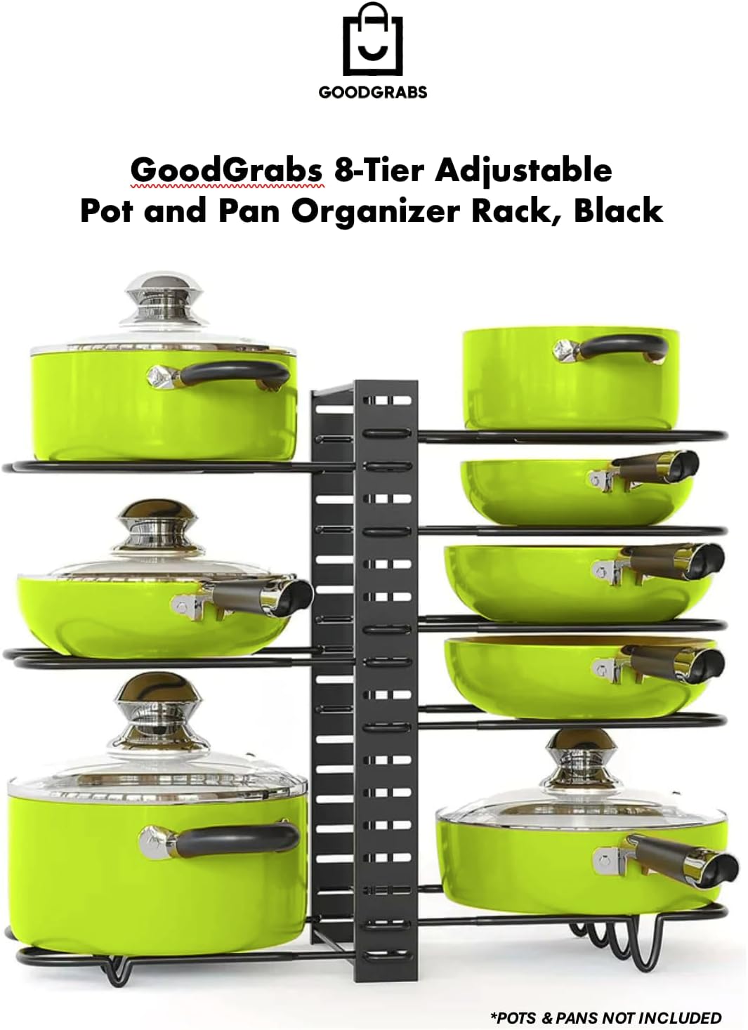 Streamline your kitchen storage with the versatile GoodGrabs 8-Tier Adjustable Pot & Pan Organizer Rack. Designed to accommodate all your cookware, this adjustable organizer provides a customizable solution for a clutter-free kitchen. Keep your cookware cabinet neat & orderly with our pot & pan organizer rack. You’ll free up cabinet or counter space for a tidier look with less clutter. Perfect for organizing all of your plastic storage bowls and lids, too!Transform your kitchen storage with our Versatile 8-Tier Pot & Pan Organizer. Experience the convenience of a well-organized kitchen and make cooking a pleasure.Maximize your kitchen storage space with the versatile 8-Tier Adjustable Pot and Pan Organizer Rack. Designed for heavy-duty use, this black organizer provides a practical and efficient solution for storing pots, pans, and lids of various sizes. With its adjustable design, you can customize the rack to fit your kitchenware perfectly, ensuring a clutter-free and organized cooking area. This organizer rack offers two setup options: freestanding for easy placement on countertops or inside cabinets, and wall-mount for saving even more space. Made from durable materials, it’s built to hold heavy pots and pans securely without bending or warping. The sleek black finish complements any kitchen décor, adding both functionality and style.