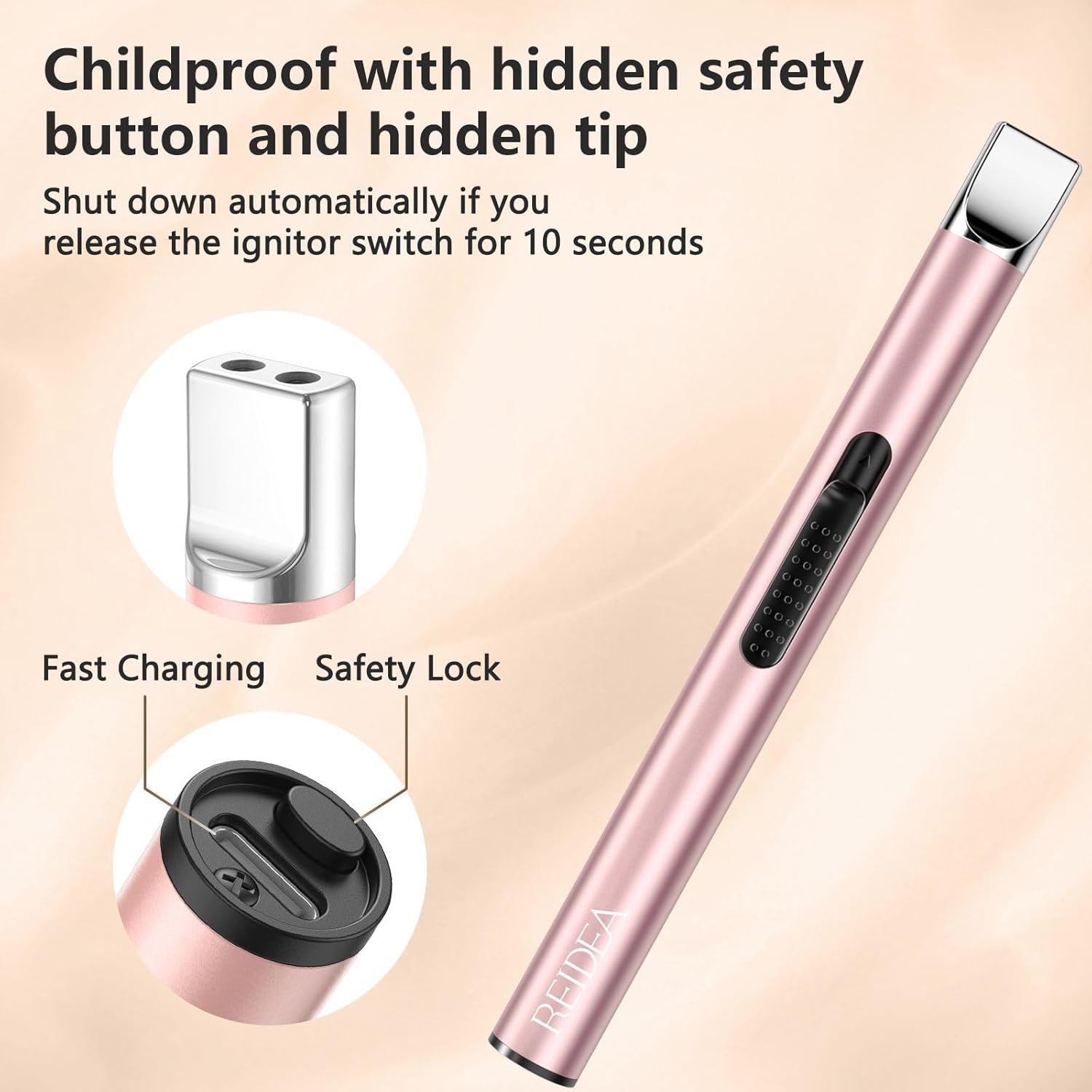 Simple turn on the hidden safety switch at the bottom (The power indicator goes on), and then press and hold the ignition button to light your candle, we are able to light candle faster, safer and easier. Arc keeps up to 7s each time for safety, slide the ignition button up again to regenerate arc.