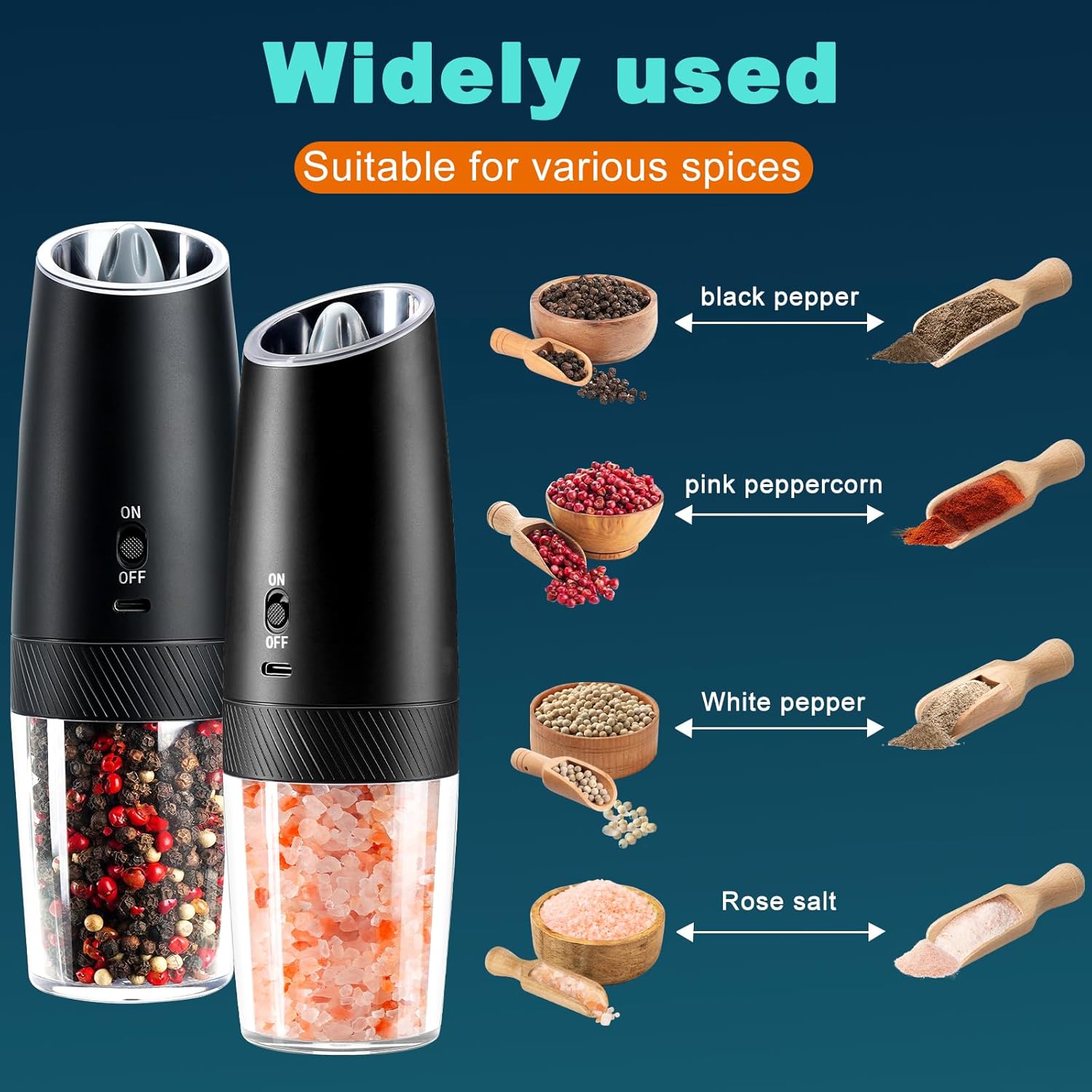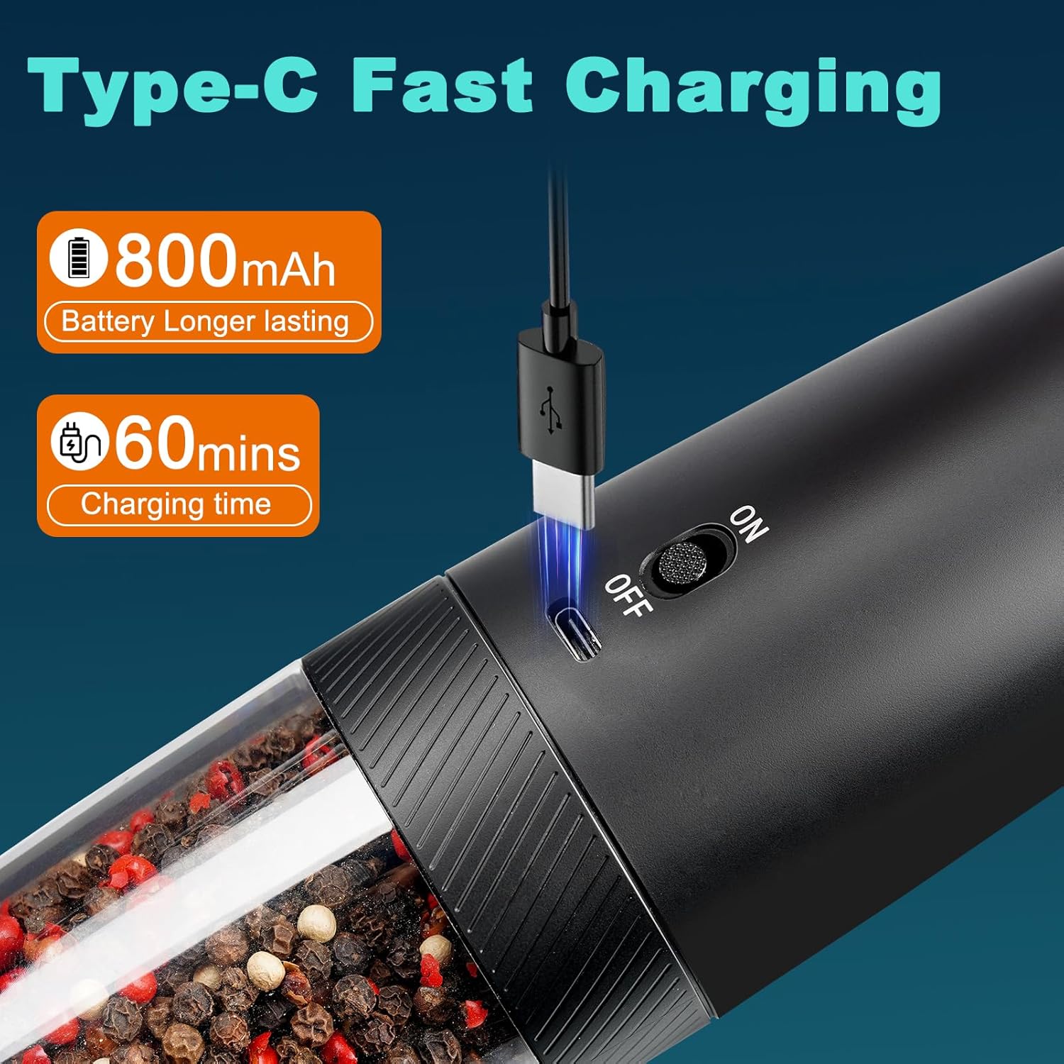 Rechargeable and Long Lasting Times: Our spice grinder has a built-in 500mAh rechargeable battery, fully charged and used 2 minutes a day, it can last up to a month. Comes with two Type-C charging cables, you can use your cell phone charger or other 5V USB charging port to charge it. Say goodbye to those products that use AAA batteries and save your money