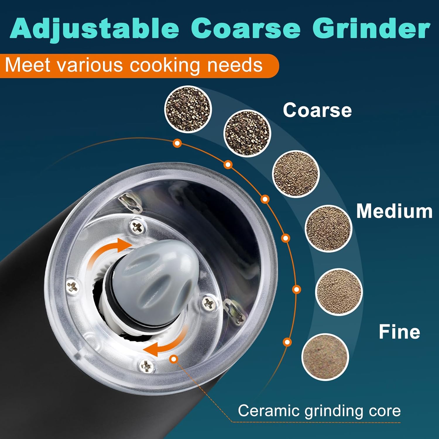 Ceramic Grinding Core Adjustable Coarse: We choose sturdy and non-rusting ceramic grinding core, say goodbye to ingesting heavy metals, really suitable for grinding salt. With the adjusting knob on the front, you can conveniently adjust the coarseness of the seasoning, great for kitchen, restaurants, parties and outdoor picnics