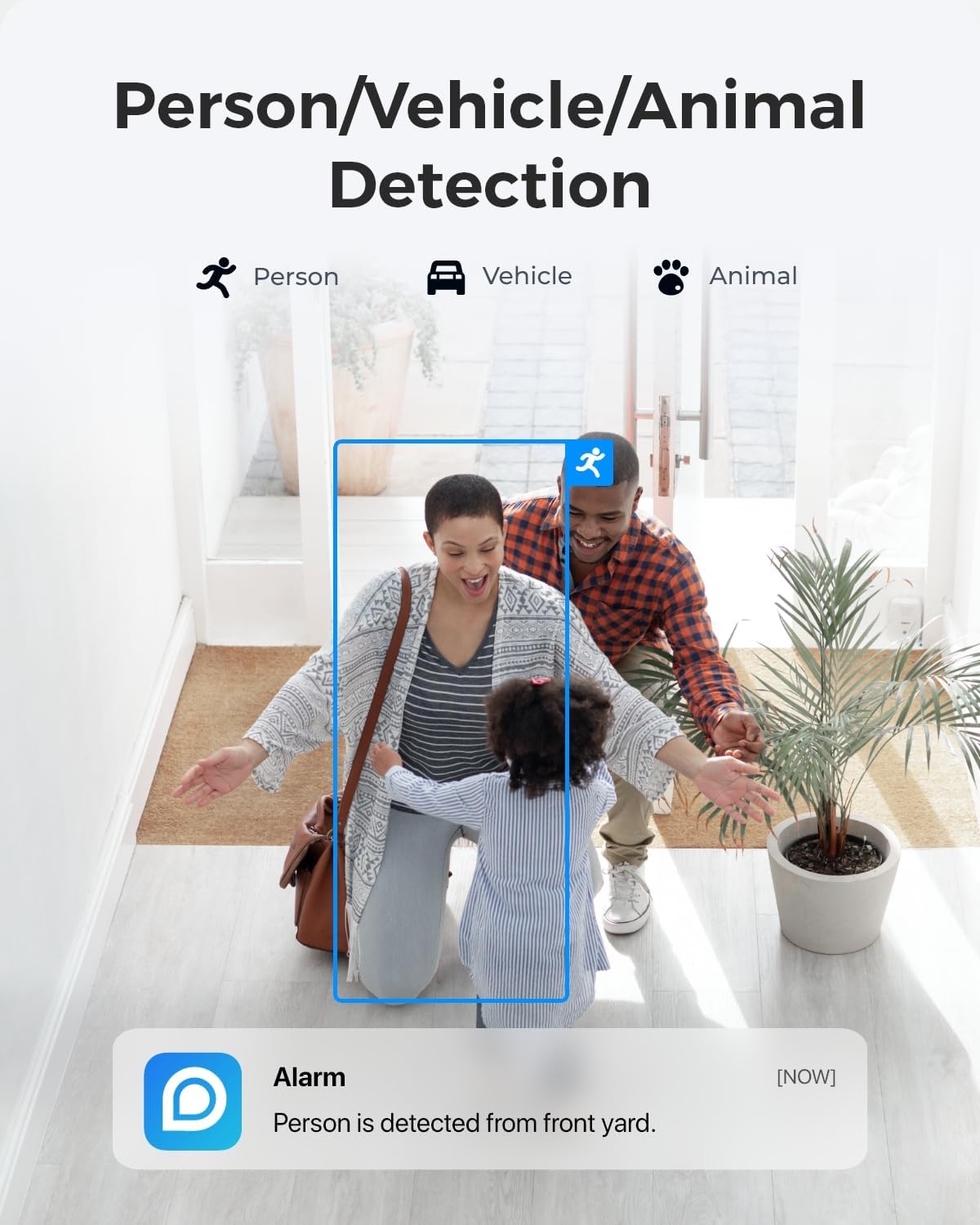 [PERSON/VEHICLE/ANIMAL DETECTION] Equipped with advanced detection technology, this system distinguishes people, vehicles, and animals from other objects, reducing unnecessary alerts sent to your phone.