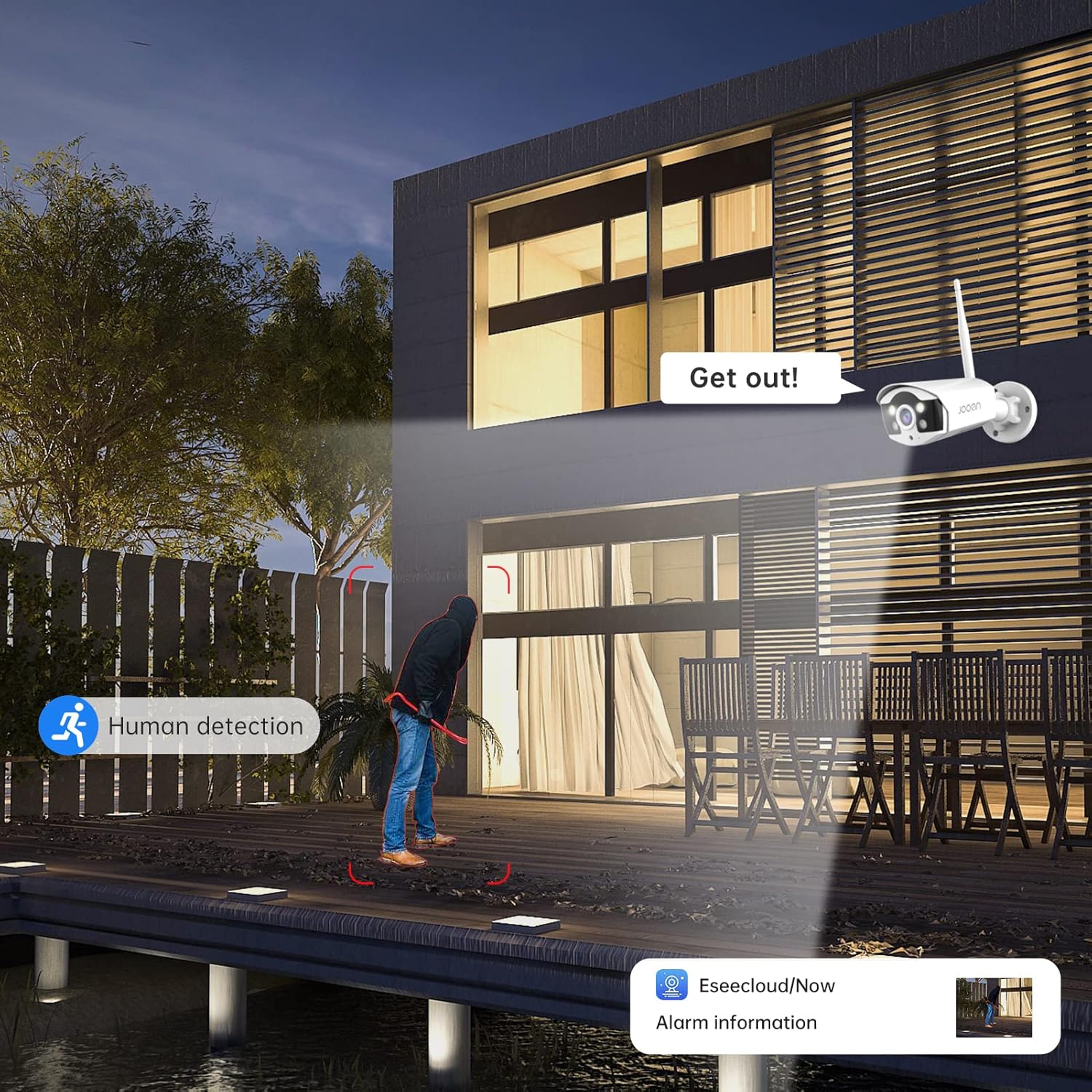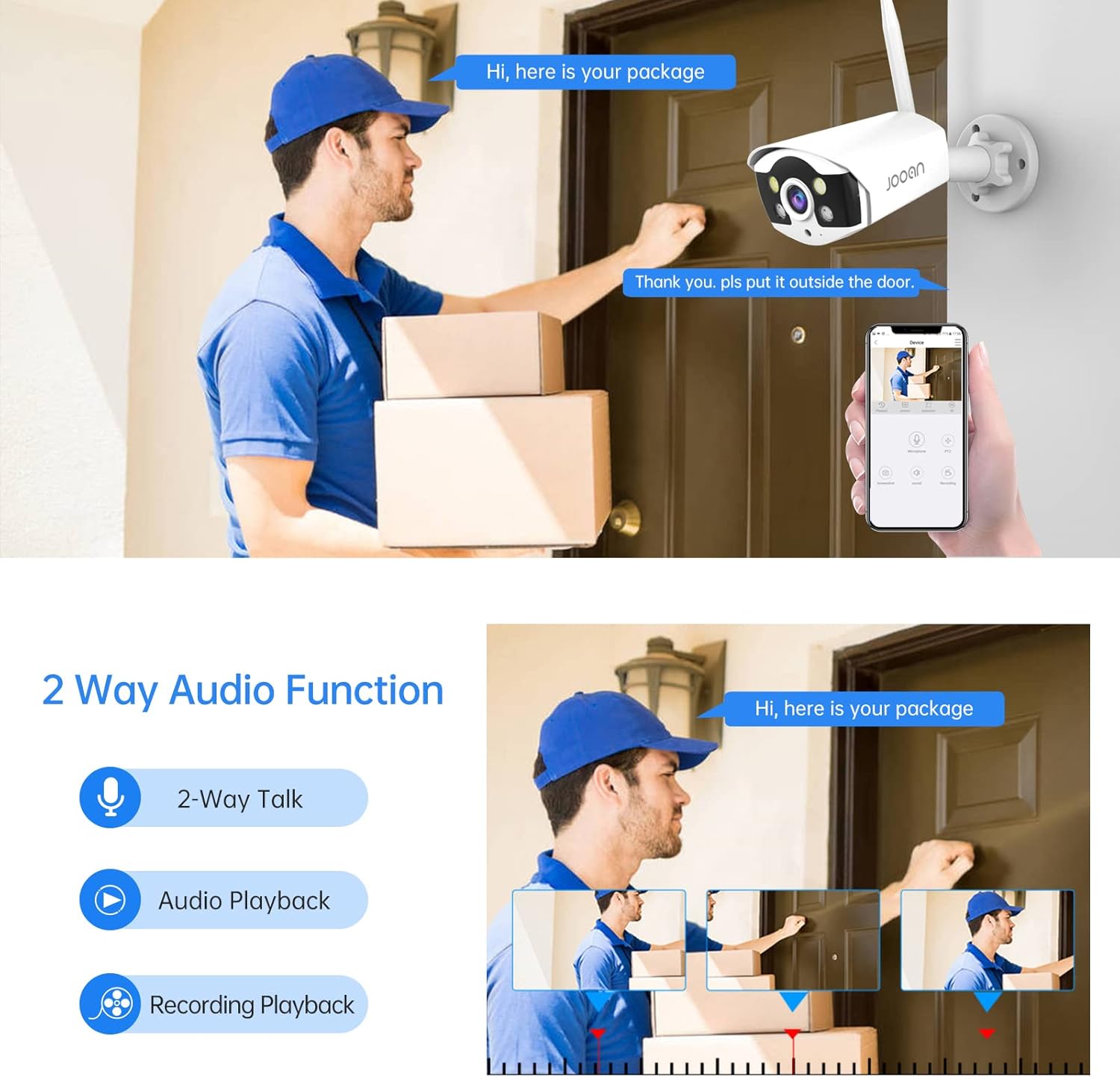 Equipped with Two Way Audio: Built-in microphone and speaker, security camera system supports live view and communication with family and visitors anytime and anywhere or ward off would-be burglars.