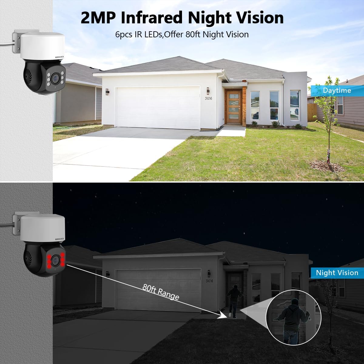 {Super Night Vision} Embrace a new era of clarity with the OOSSXX outdoor cameras. Equipped with a high-resolution 2MP sensor and an IR cut filter, this security camera deliver unmatched visuals day and night. Enjoy a 80ft night vision range and an expansive 130° viewing angle, ensuring comprehensive coverage around the clock.