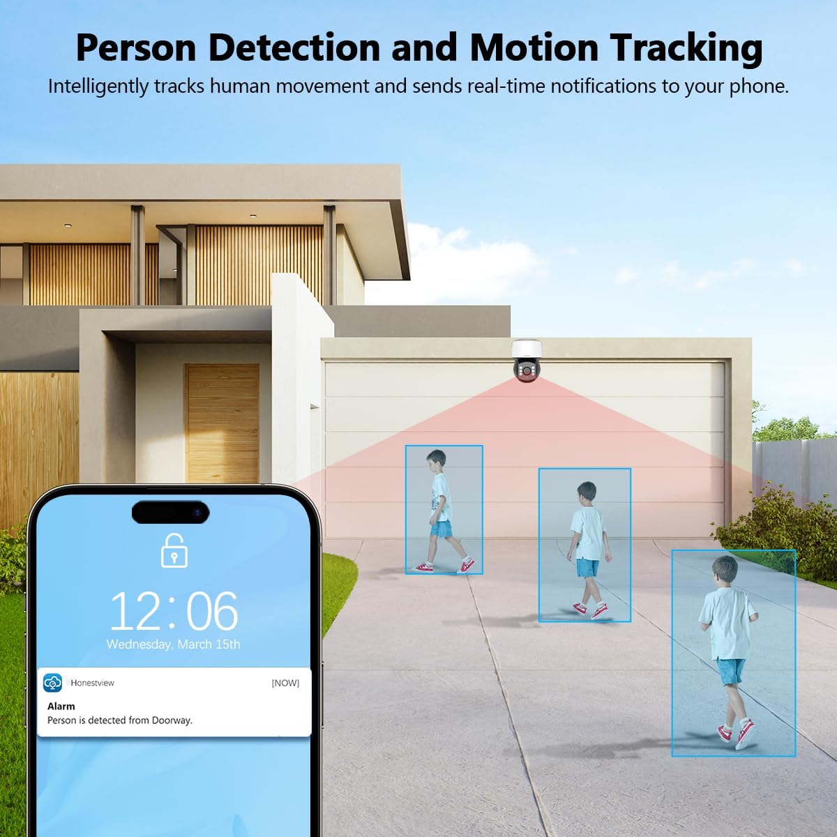 {Remote Access and Motion Detection Alerts} Home security systems camera operates normally offline, only requiring an internet connection when remote access is needed. Stay connected and in control by remotely viewing your surveillance footage. Whether you’re at home or away, you can easily check the live feed from your camera, ensuring you’re always aware of your surroundings. And intelligently tracks human movement and sends real-time notifications to your phone. It focuses on crucial targets, reducing false alarms.