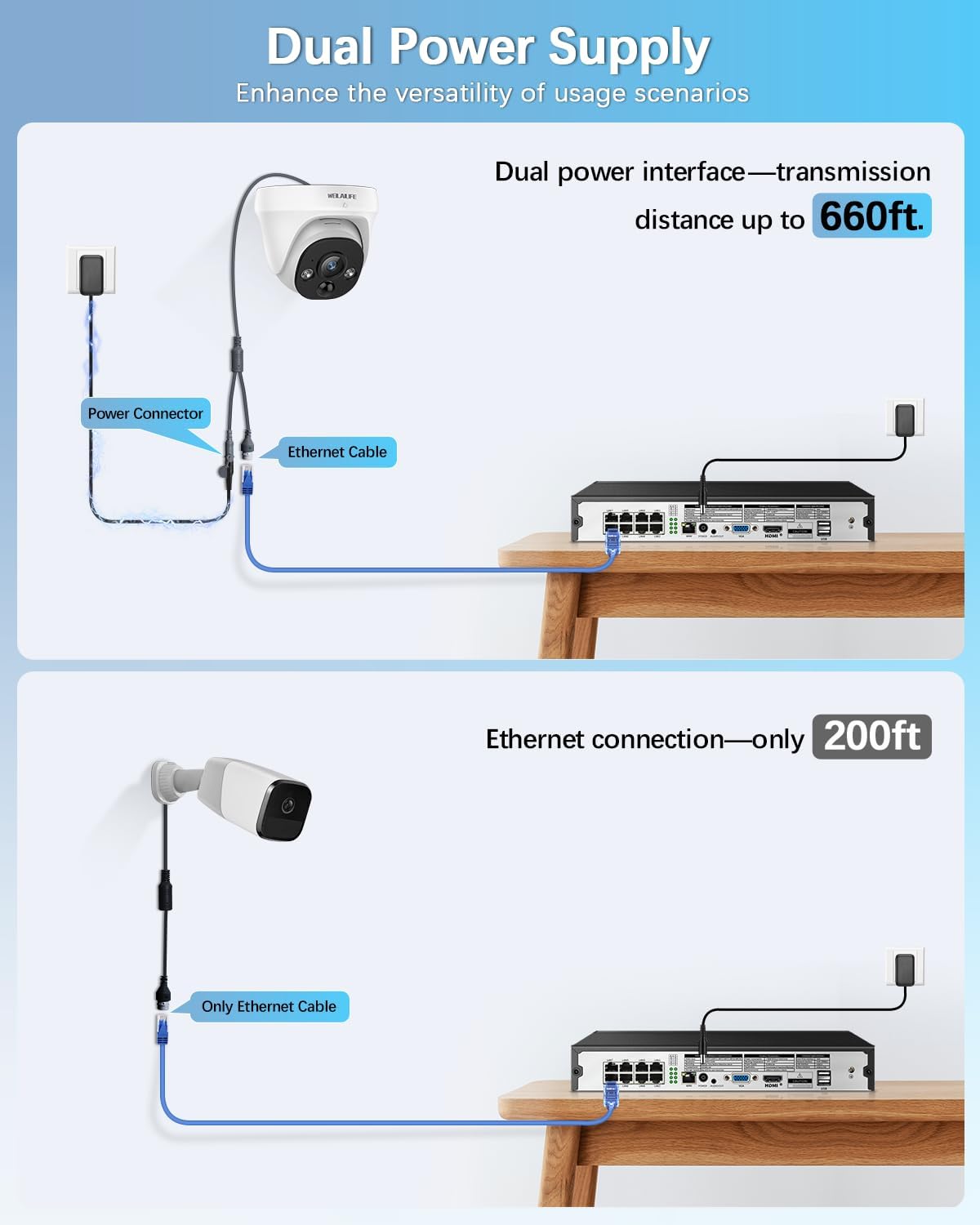 【Dual Power Supply Mode】The WEILAILIFE outdoor security camera system offers two power options: Ethernet and power connectors. The PoE Ethernet cable provides up to 60 meters (200 feet) of transmission, while the power connector of the POE IP camera extends the range to over 200 meters (660 feet). This dual power setup enhances stability and coverage, tripling the transmission distance of Ethernet alone.
