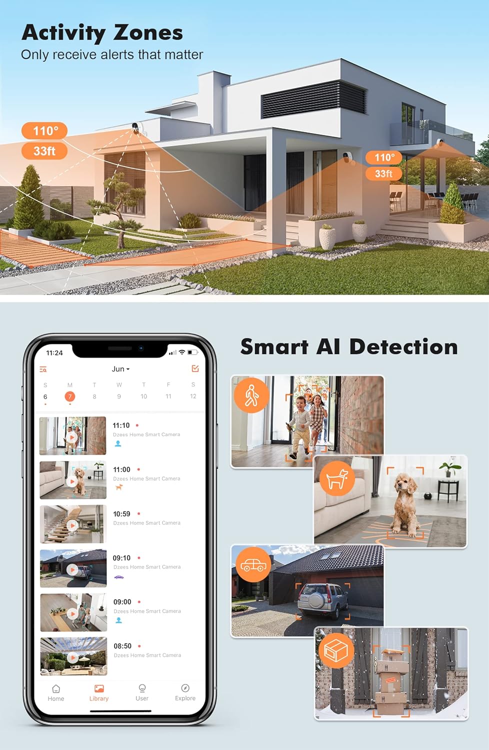 【Smart Motion Detection & AI Recognition】 Dzees security camera adopts artificial smart sensors can tell humans, pets, vehicles and packages, fewer false alarms. When the upgraded PIR motion sensor detects motion, it will record the video and obtain an accurate instant alert snapshot on the mobile phone.