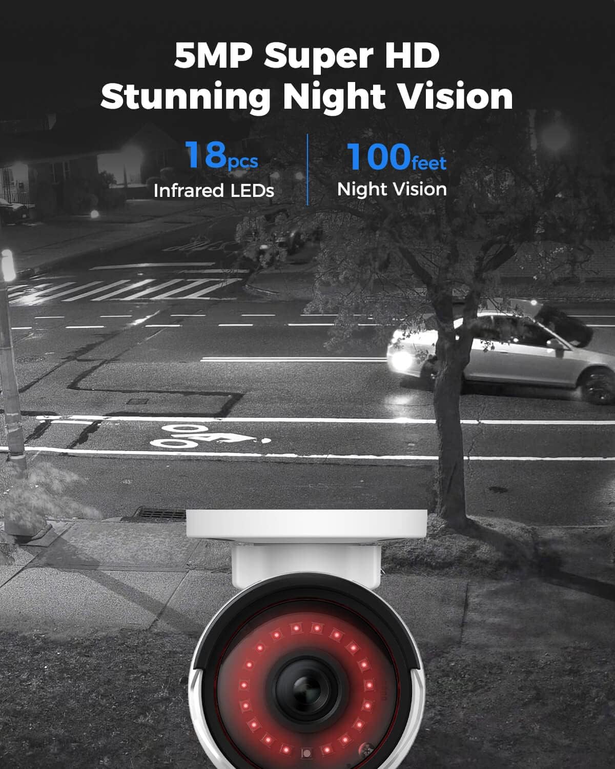 5MP SUPER HD & STUNNING NIGHT VISION – Capture crystal clear videos day & night with 5MP super HD cameras. The 18pcs infrared LEDs allow you to get high-quality night vision up to 100ft, helping you to protect your property even at night.