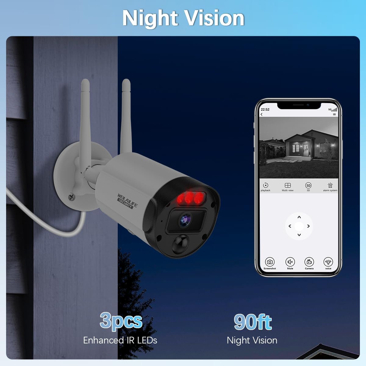 【90ft Night Vision】This wireless security camera system is equipped with an IR cut filter and automatic switch, guaranteeing clear viewing even in low-light conditions, WIEILAILIFE outdoor wireless security cameras boast excellent night vision capability, extending up to 90 feet. With this home security system, you can achieve clear surveillance day and night, ensuring reliable surveillance cameras for home security.