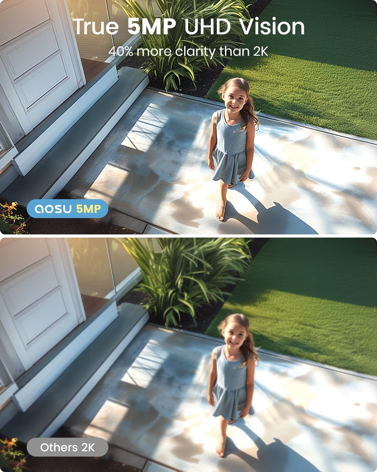Clearer, Sharper: 3K/5MP resolution offers a 40% clearer image than 2K. Capture crystal-clear faces and license plates so you know exactly who is coming and going. The spotlight of this aosu outdoor security camera leaves no detail unseen and ensures vibrant and clear night vision. Ideal for nighttime security and enhancing object recognition precision.