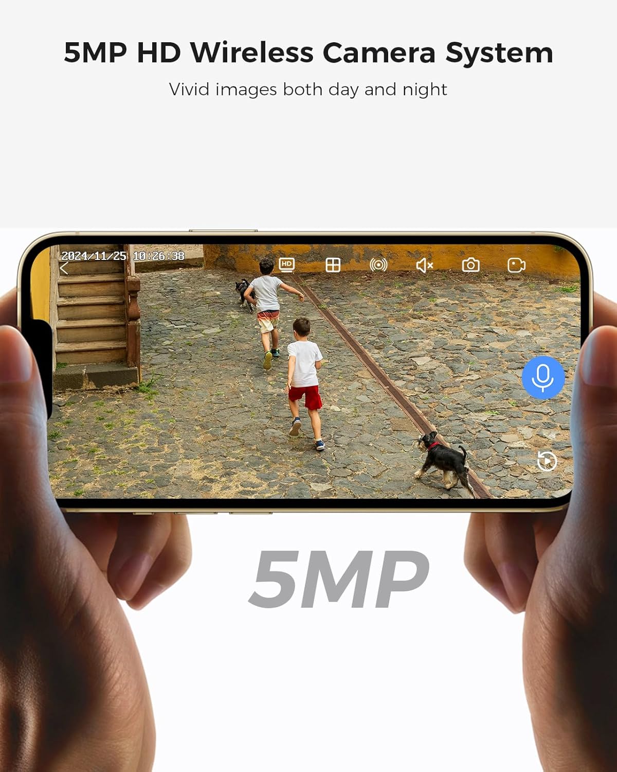 Stunning 5MP Ultra-HD Video, Infrared Camera: The 5.0MP resolution provides 2560 x 1920 megapixels, offering clarity about 2.5 times that of 1080p. The camera features three array infrared LEDs, allowing you to see up to 65 feet in night vision, even in complete darkness. The outdoor security camera system also enables you to see and listen to people on your property remotely via the app.