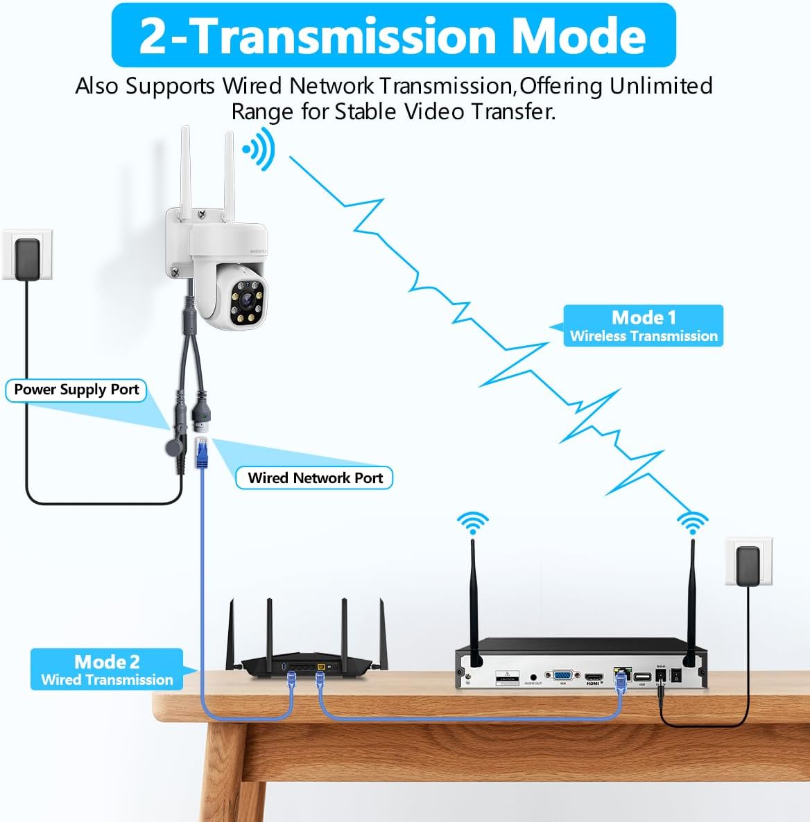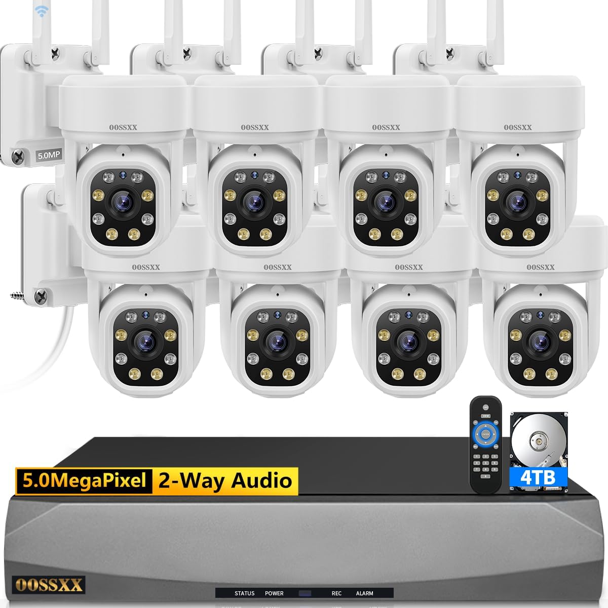{10-Channel System & Crystal-clear Night Vision} The 10 Channel Dual WiFi 3K Network Video Recorder supports up to 10 cameras, and it comes with 4Pcs 5MP IP66 Waterproof Two-Way Audio Security Cameras.You also can add 6 more wireless cameras for home security, Supported connect with solar, battery, PTZ cameras. With 8 Infra-Red LEDs in each camera, the security cameras wireless outdoor are able to see up to 80ft in darkness, providing you with crystal-clear night vision support.