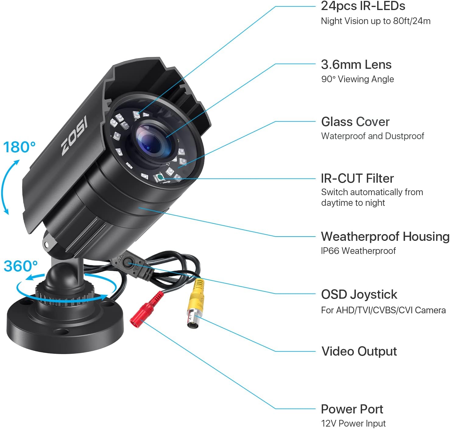 Image Sensor: 1/3〞CMOS CMOS with IR-Cut. Lens: 3.6mm Active Pixels: 1920(H)×1080(V). Singal mode: CVBS 960H / TVI / AHD / CVI. IR LEDs Amount: 24pcs, 5mm LEDs. IR Distance(night vision): up to 80FT Made: Aluminum Metal Casing Power supply: 12V 500mA