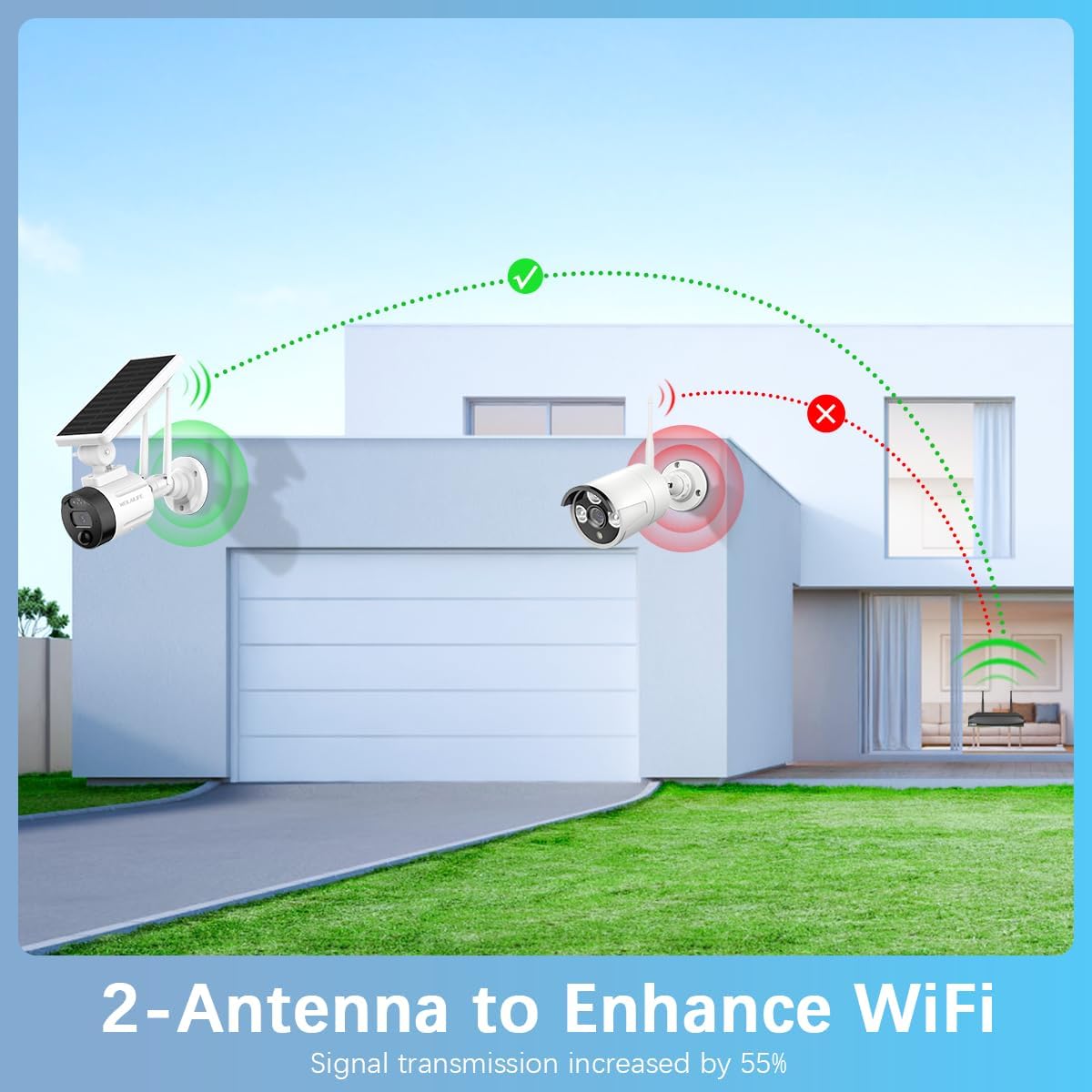 【2-Antenna to Enhance WiFi】To ensure optimal wireless signal strength, the wireless solar surveillance camera system has been upgraded to dual antennas. This enhancement increases the wireless range by approximately 50%, resulting in smoother and clearer video transmission. This upgrade enhances the flexibility of using this outdoor security camera.
