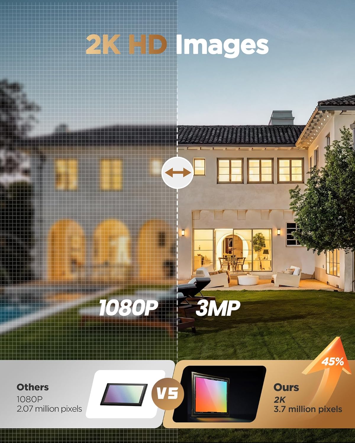 【2K Resolution & Stay Away from Mosaic】This security cameras wireless outdoor Equipped with latest 2K resolution technology further enhances the camera’s visual effect. Compared to a full screen mosaic, you are more likely to see clear videos from this outdoor security camera, giving you a different user experience. Whether it’s observing small animals or finding invaders, it’s easier. Nice security camera system.