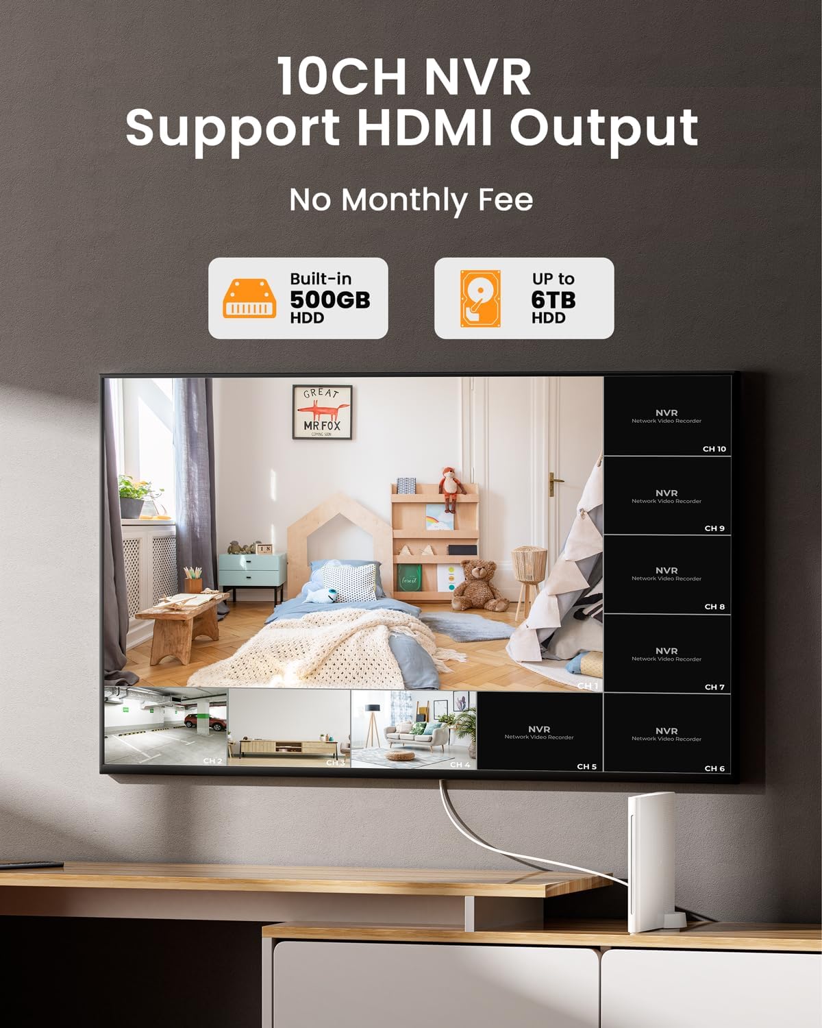 No Monthly Fee with 10CH NVR: The solar security camera system supports to expand to 10 channel, meet your needs to monitor more areas. In addition, you can connect the NVR to a larger screen/Smart TV/PC via HDMI port to view the camera. The system comes with a 500GB HDD pre-installed, expandable to 6TB ( supports 2.5-inch hard disk only),without any monthly or hidden fees. Please format the hard disk before first use