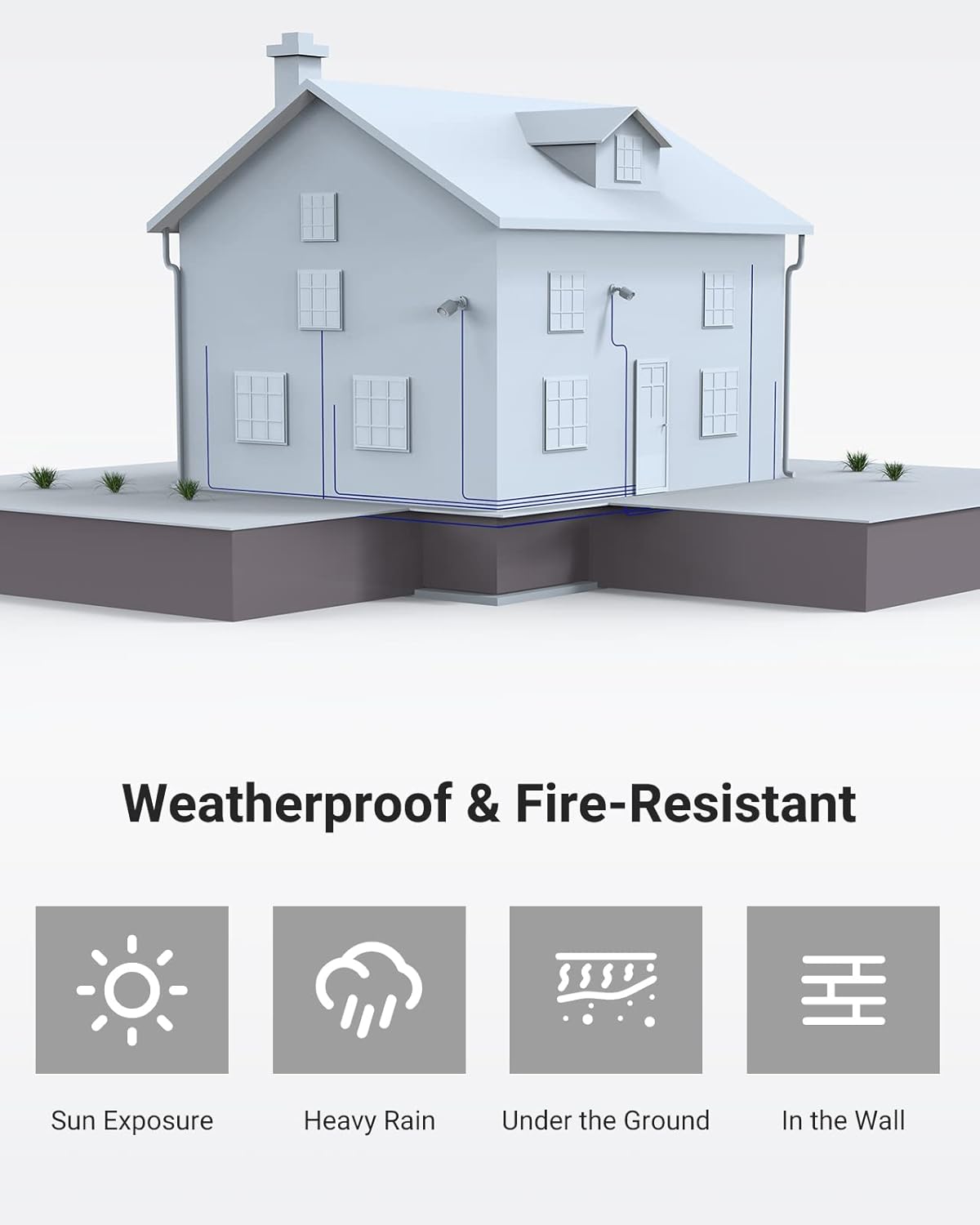 【Flexible & Weatherproof】The cable is plug-and-play and well adaptive to various application scenarios like the surface and inside of walls, floors, etc. Built with PVC-45P molding, it is flexible, resilient and weatherproof for indoor and outdoor use.