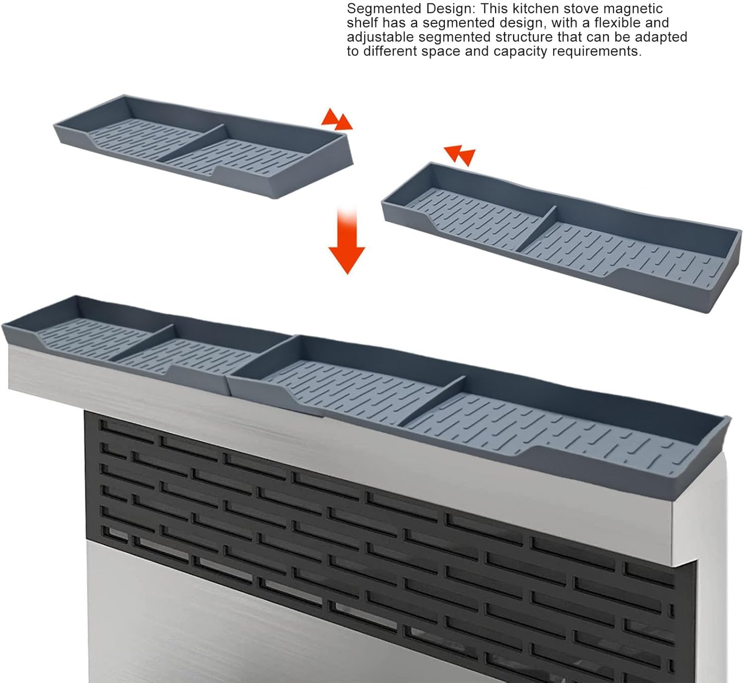 FLEXIBLE ADJUSTMENT: The segmented design of this kitchen stovetop magnetic shelf allows users to flexibly adjust the length and combination of the shelves according to actual needs. Whether it is small space or large capacity needs, it can be easily dealt with to achieve personalized storage.