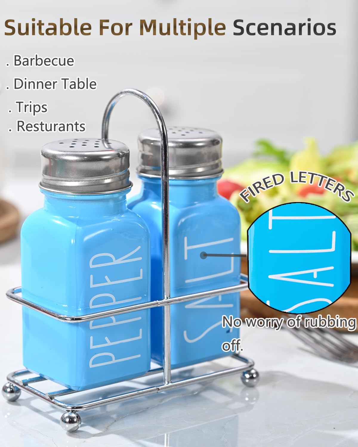 Never Worry The Letters Rubbing Off: Our salt and pepper shakers is fixed with letters, no worry of pealing of on daily use, but be noticed, it’s not dishwash safe, just clean it with water.