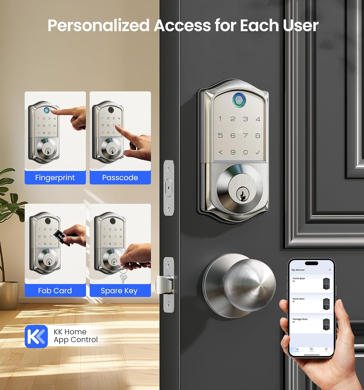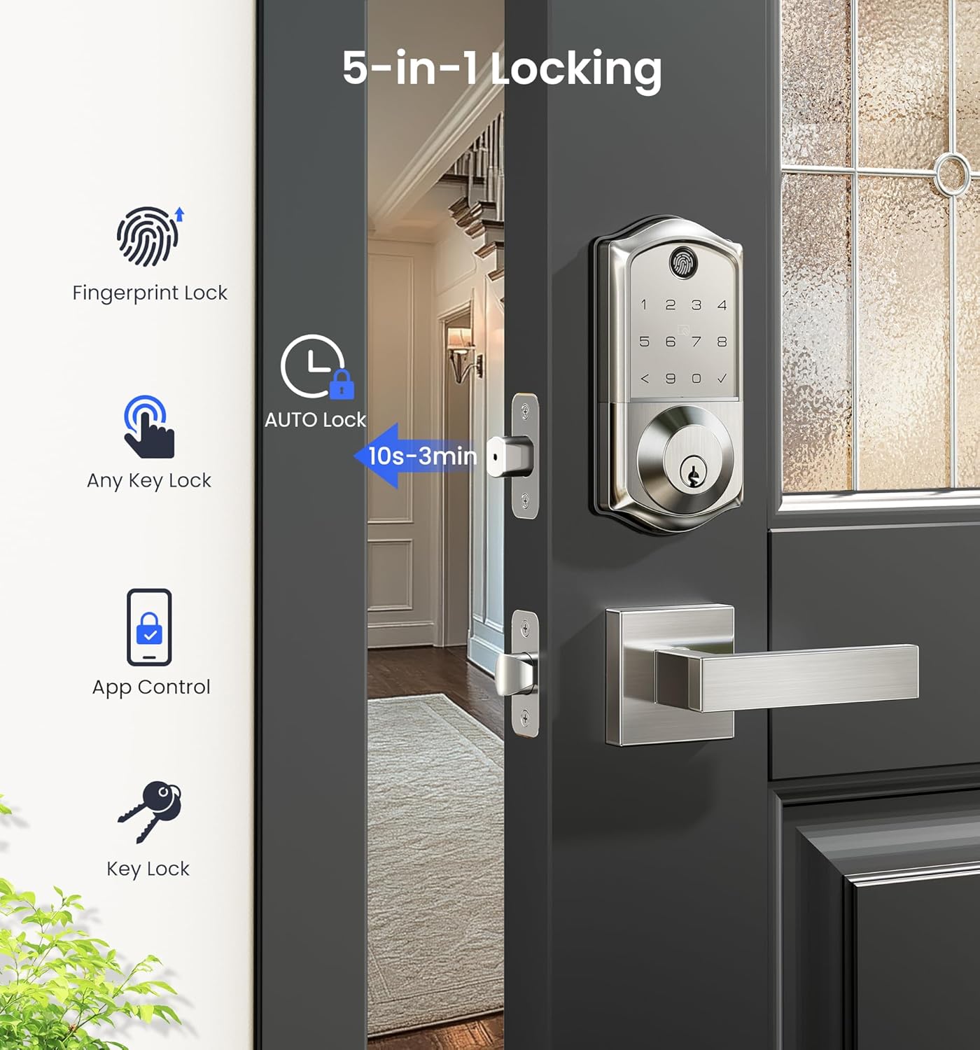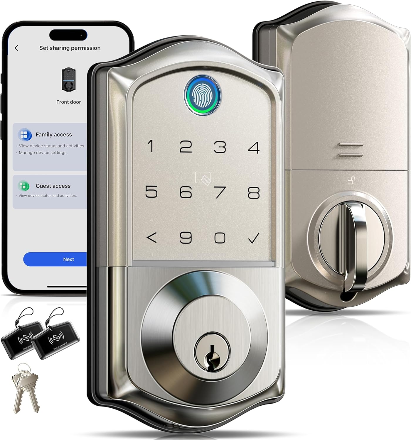 7-in-1 Smart Access: Unlock via fingerprint (Swedish FPC tech), App, authorized access, RFID card, code, code sharing, or mechanical key for versatile use; Includes 5 locking methods: Auto lock+ Fingerprint + Any Key + App + Mechanical Key