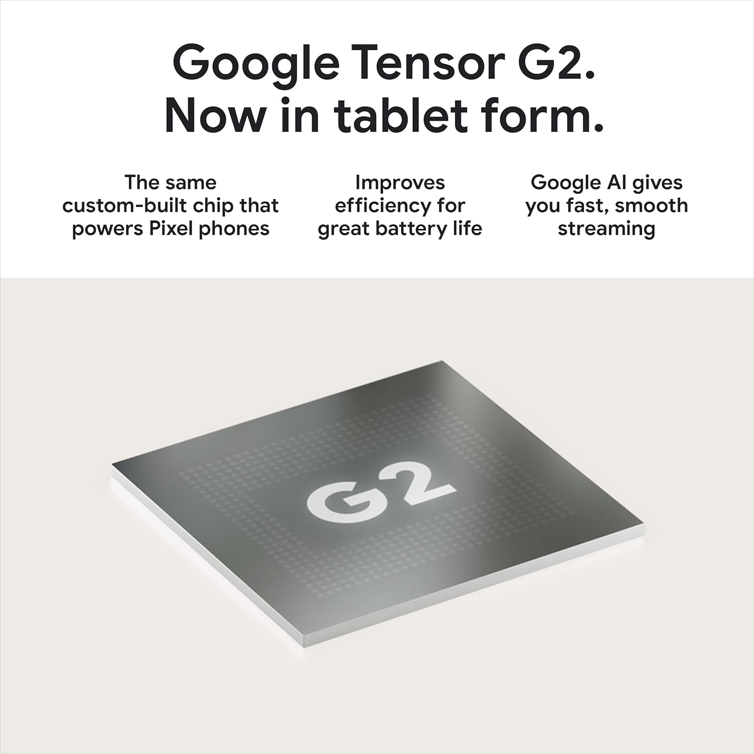 Engineered by Google, the Pixel Tablet is the first tablet with the Google Tensor G2 chip built in; it features Google AI for smooth streaming, high-quality video calls, an efficient battery, and more.