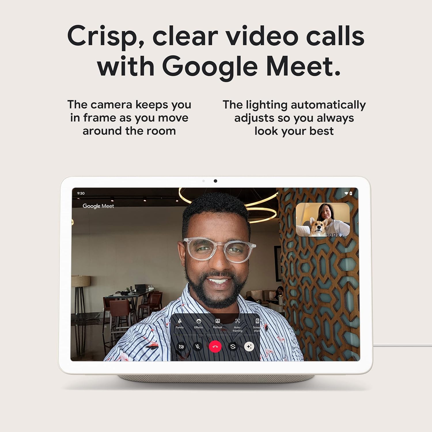 The Pixel Tablet comes with Google Meet for HD video calling[7]; the camera follows you so you can move around the room while staying in frame, and automatic lighting adjustments keep you looking your best