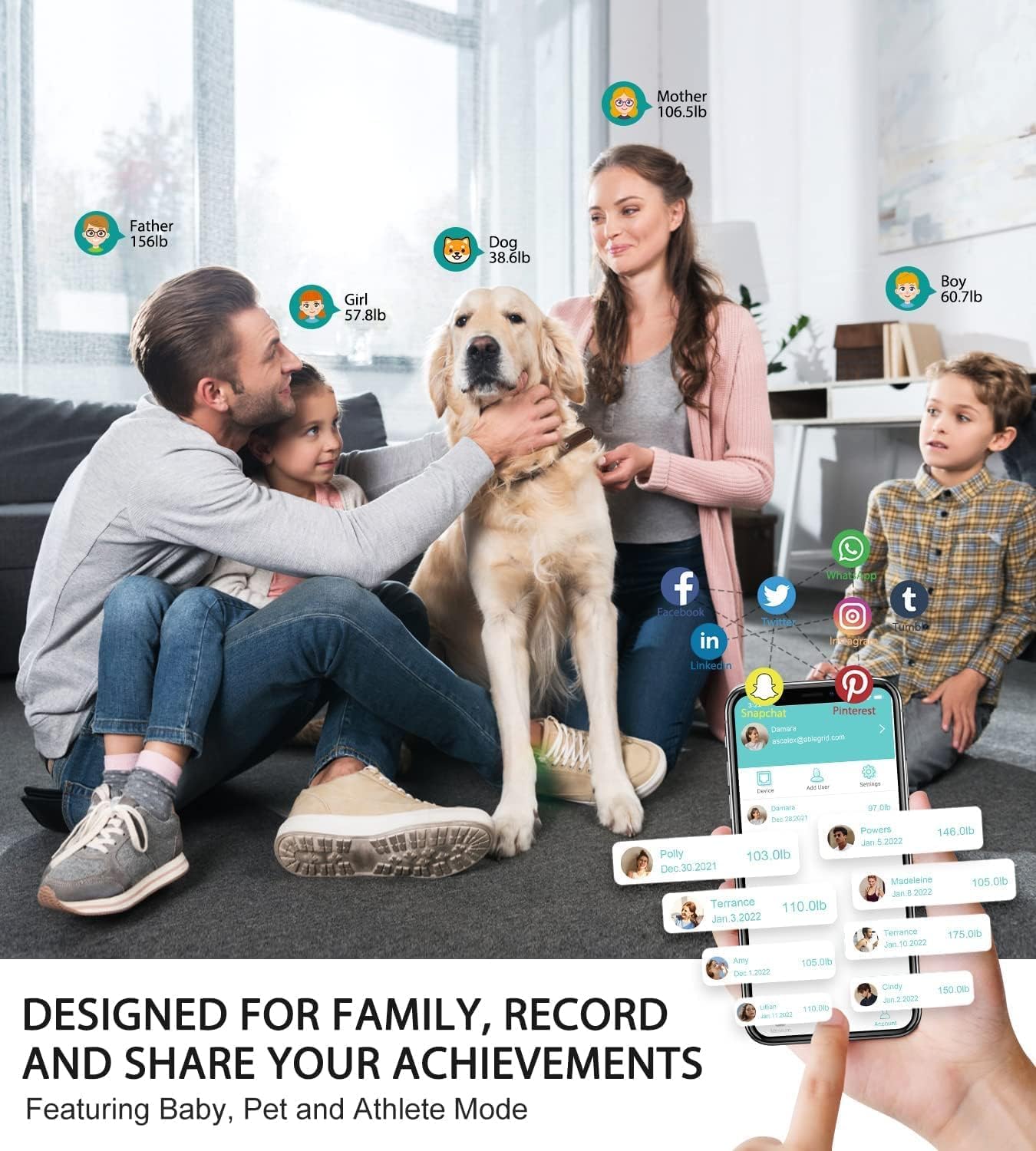 6.Multiple User Profiles: The “Fitdays” APP allows for unlimited user accounts, each holding up to 24 member profiles. It’s smart enough to automatically recognize who steps on, each user will receive the data on their own devices conveniently, which allows for seamless tracking of your family’s health. Use guest mode for a non-recorded check-in or baby mode to track your baby or pet’s weight growth conveniently, the athlete mode provides more accurate measurements for professional athletes.