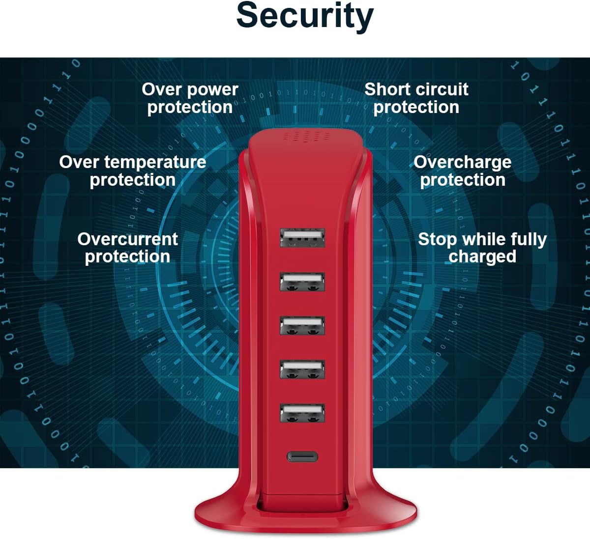 40 Watt Charging Power.5 USB Ports, up to 3.1 amps for a single port, total 6 amps.1 Type-C fast charging port.5 feet power extension cord offered.Hot runner process shell, 1382℉ anti-combustion.