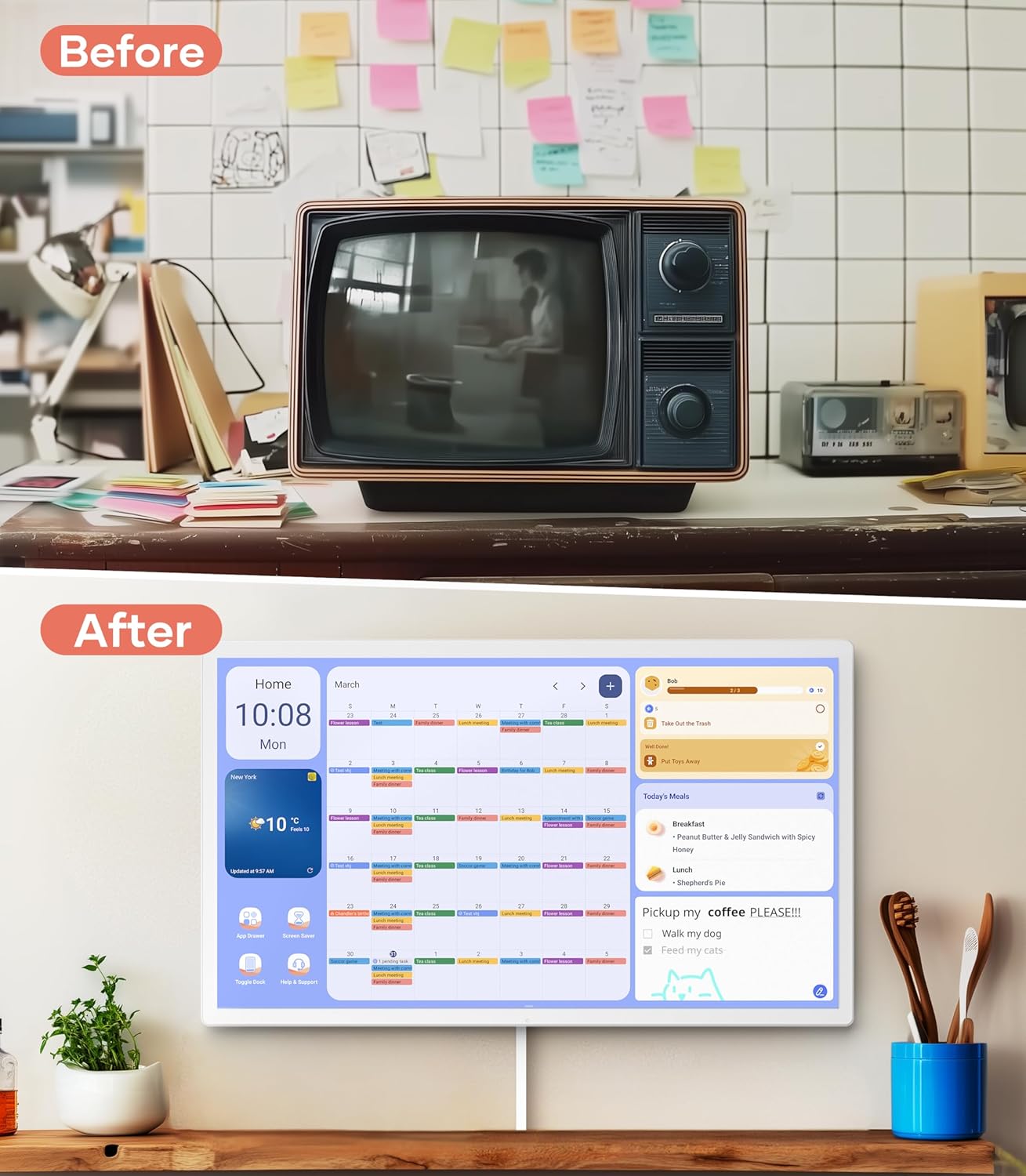 Personalized Dashboards: You can download any apps from the Google Play app store to this electronic calendar for family, drag and drop widgets like calendar, chore list, meal plan, media player, weather, etc to create multiple dashboards.