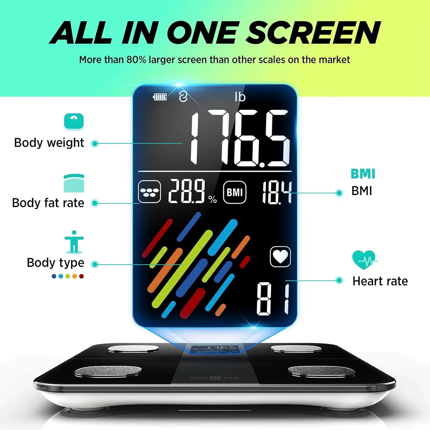 All in One Display: Unlike normal smart body fat scales, the RunSTAR scale with an extra large VA display screen enables you to get 5 key body metrics even without your phone. The screen shows weight, body fat rate, BMI, heart rate and body type at the same time within 15 seconds. You can completely free your hands to know your basic health condition at a glance.