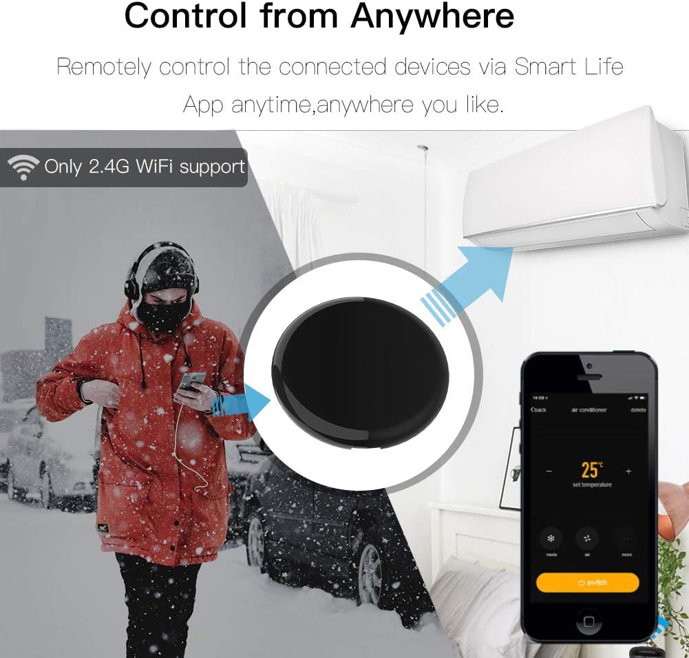 MoesGo all-in-one IR remote control activates air conditioners, TVs, fans, DVD players, set top boxes, and more, and is compatible with Amazon Echo and Google Home. It supports wireless remote control via the Smart Life app, and can be used to control almost any device in rooms less than 16m². It includes a special DIY function to control even more devices, and allows you to share control with multiple phones, so the whole family can get involved.