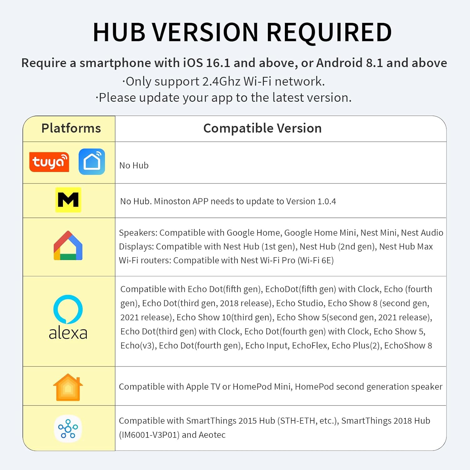 [Fast and Easy Setup] Simply plug in a device, connect to your Wi-Fi network, and download the app on your cellphone. No hub is required to add to Smart Life or Minoston APP. The hub and apps needs to be updated to the lastest version for Matter compatibility.. Note:It only supports 2.4GHz Wi-Fi network, not 5.0GHz Wi-Fi.