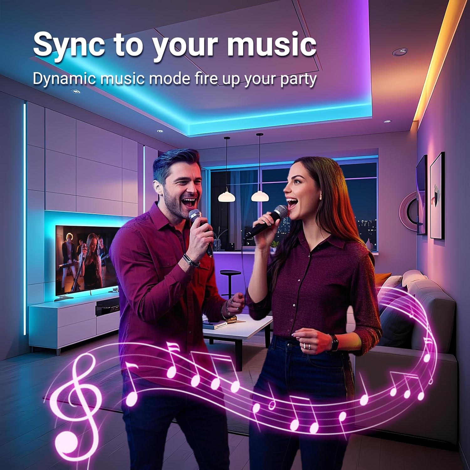 Music Sync: With built in mic, the led light strip dances to the ambient sound; Sync lights to the beat of any song whether you want to get party started or indulge in the exciting, intense computer game playing; The lights for room can change color and sync with the rhythm of the sound and music