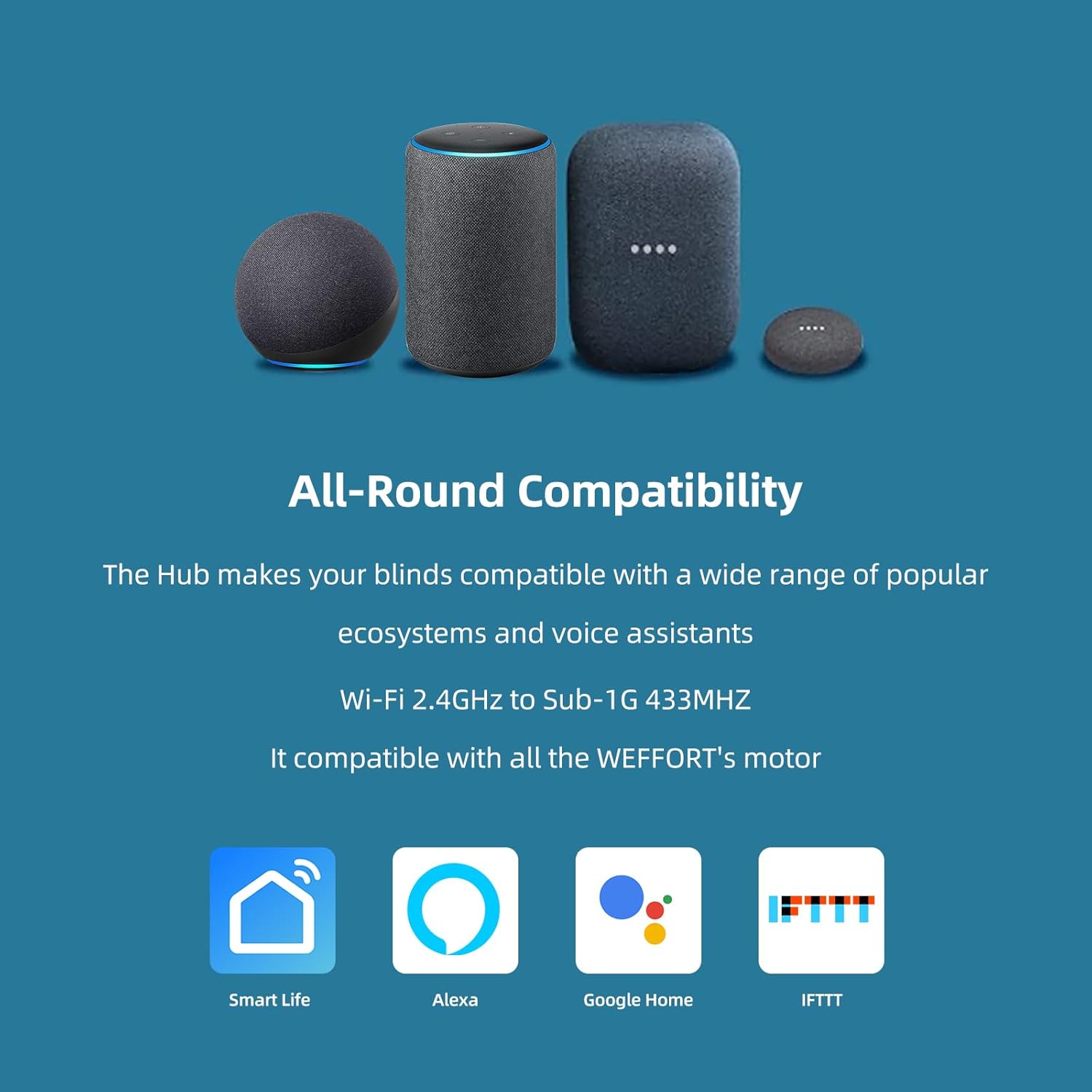 All-Round Compatibility: This Weffort Hub can support a bridge function to make your blinds compatible with a wide range of popular ecosystems and voice assistants. It can help your motor be connected with Smart Life, IFTTT, and all versions of Alexa or Google Home.