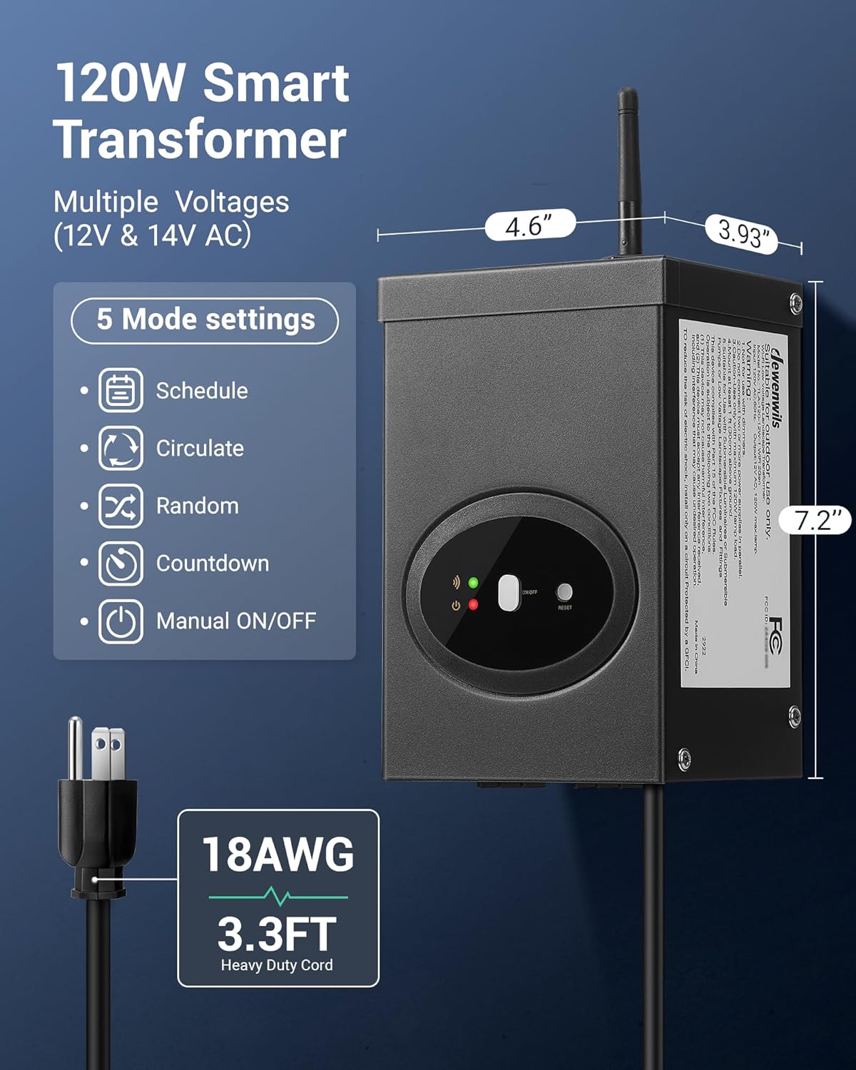 [Schedule & Timer Function] This smart low voltage transformer allows you to spend vacation more safely and trustingly under Vacation mode; also 5 Timer modes available- programmable timer/ countdown timer/ holiday random/ security random modes/ Circulate mode; convert 120V AC to 12V AC safety voltage