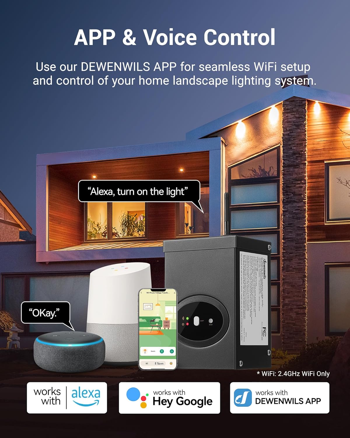 [Voice Control & Remote Control] Works with Alexa and Google Home Assistant, DEWENWILS smart low voltage transformer controls your landscaping lights by simply giving voice commands or by your smartphone; no hub required, efficient solution to enhance the home automation setup