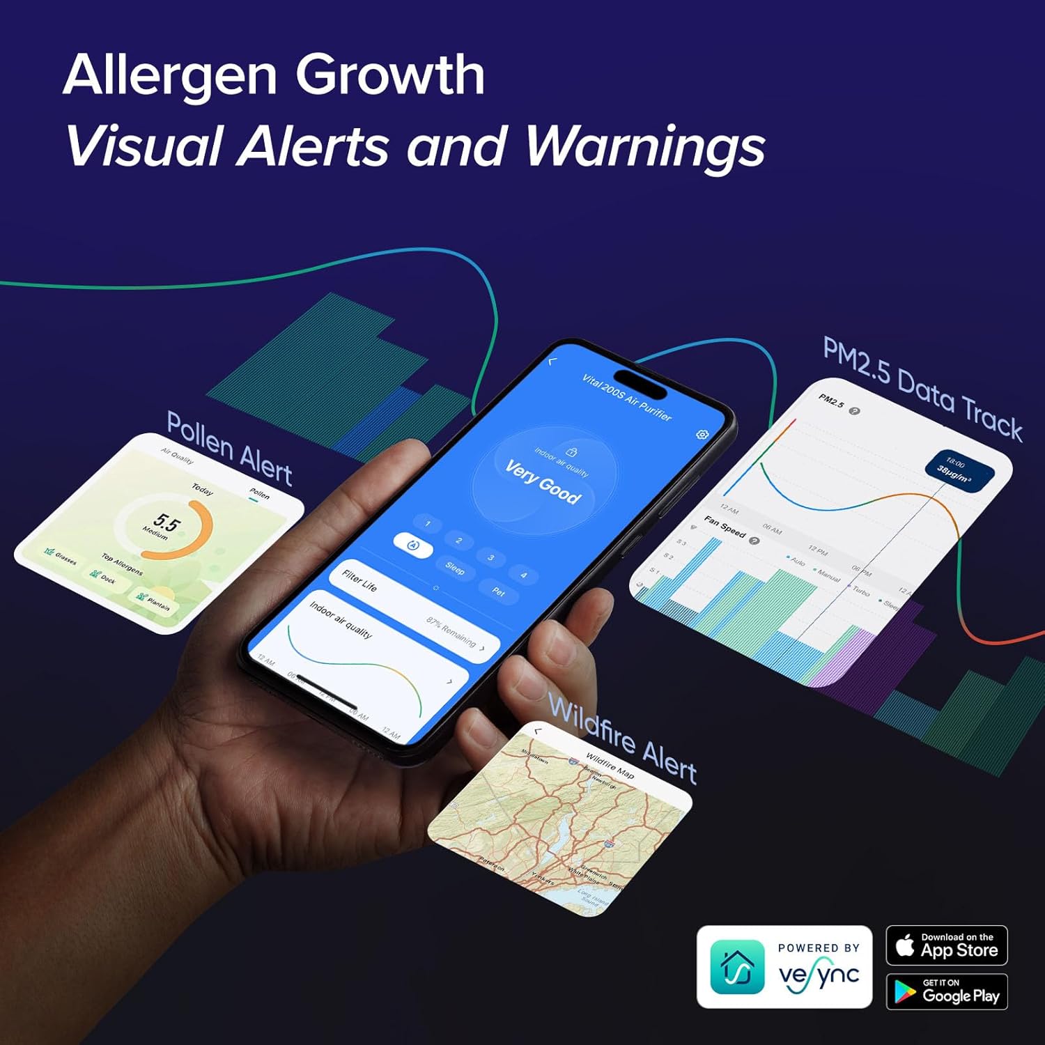 𝐒𝐌𝐀𝐑𝐓 𝐂𝐎𝐍𝐓𝐑𝐎𝐋: With the free VeSync app, you can control air purifier settings, set timers, check filter life, and connect to third-party voice assistants