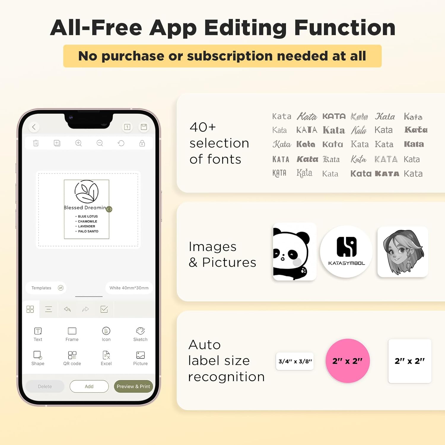Versatile App Editing Function: Easily add images from your phone or tablet; customize your labels with 40 fonts, 30 frames, and 450+ icons; all free to use
