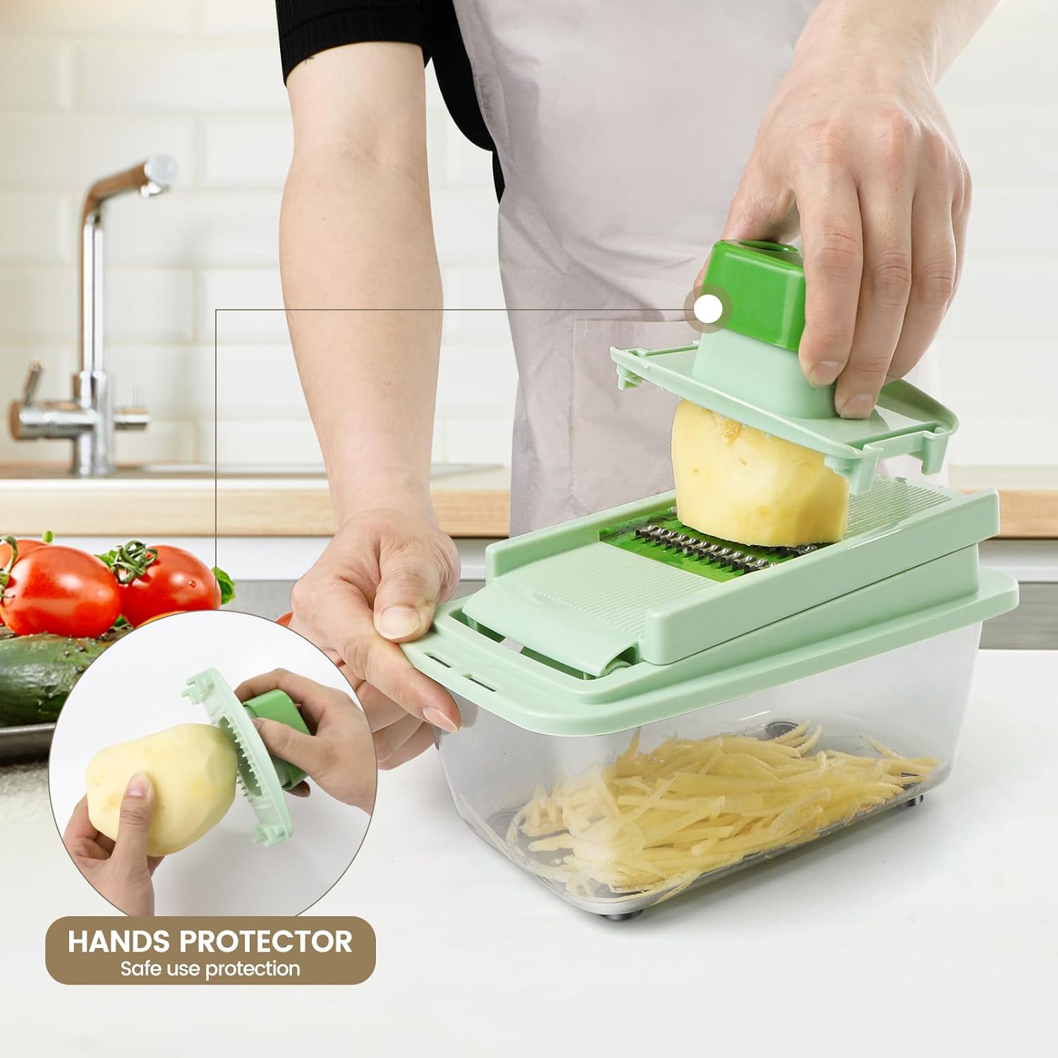 Space-Saving Design-Free up counter space with the integrated food container and use the food holder while cutting small vegetables and fruits. This prevents food from slipping, making it clean, safe, and easy to work with. The dishwasher-safe design ensures quick and easy cleanup
