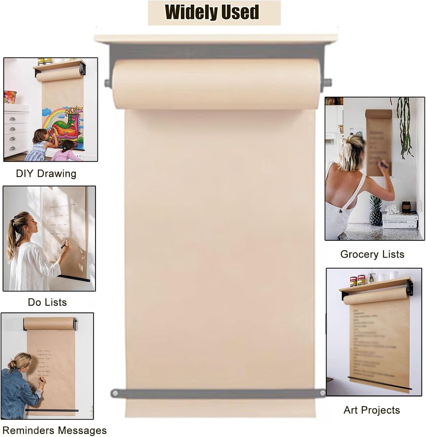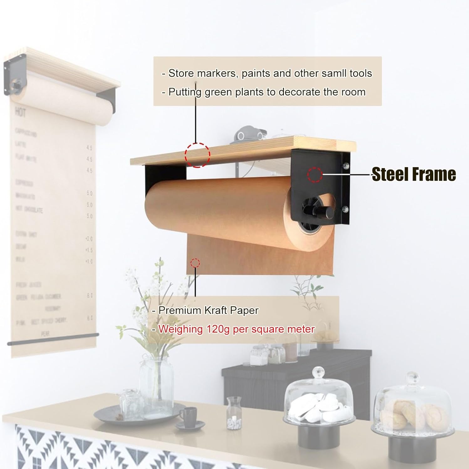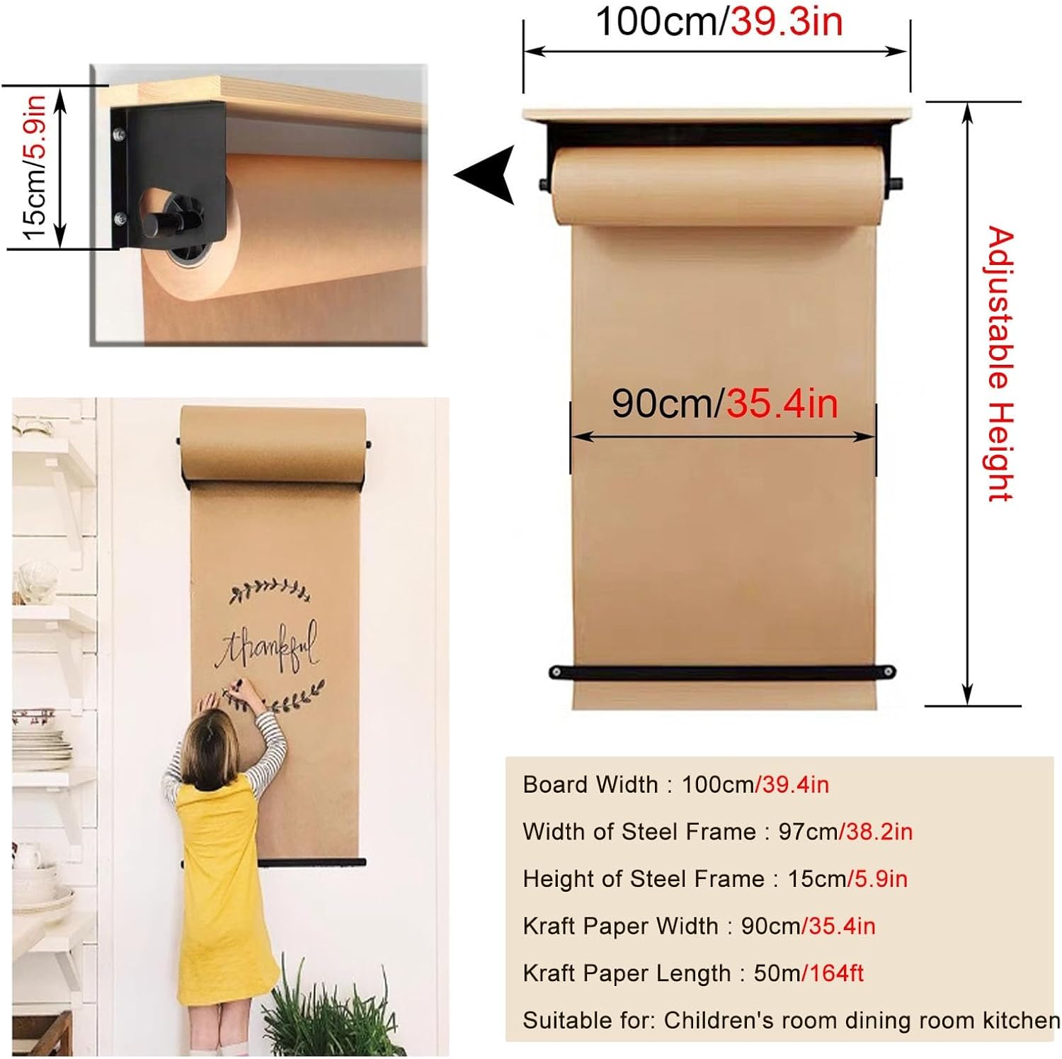 Stay organized and creative with our Kraft Paper Roll Holder. Use it as a message board dispenser, butcher paper holder, or a hanging note roll holder. Perfect for creating a weekly menu board or a versatile message board in your kitchen.Specifications:Item : Wall Mounted Kraft Paper Dispenser & CutterColor : BlackMaterial : Steel FrameKraft Paper : 50m long ( Weighing 120g per square meter )Size :Wooden Shelves Wide : 40cm/15.7in + Steel Frame Wide : 37cm/14.5in + 30x50m/11.8x164ft Kraftpaper RollWooden Shelves Wide : 70cm/27.5in + Steel Frame Wide : 67cm/26.3in + 60x50m/23.6x164ft Kraftpaper RollWooden Shelves Wide : 100cm/39.3in + Steel Frame Wide : 97cm/38.1in + 90x50m/35.4x164ft Kraftpaper RollWooden Shelves Wide : 100cm/39.3in + Steel Frame Wide : 127cm/38.1in + 120x50m/47.2x164ft Kraftpaper RollAfter the enclosed vellum is used up, you could buy the corresponding size of vellum locallyFeatures:Beautiful hardware, sturdy, thick paperSuper easy install also which is hugeIn addition, it is an ideal wall artGreat product for crafting studio or an art classroom.Perfect for To-Do Lists, Daily Specials, Menus and other Note Takingreduces desk or table-top clutter, but includes all the functionalityeasy cut bar lets quickly dispose of old creations to create new onesFrom an art station to a grocery list to a letter board replacement,for Artwork, drawingcan be applied to various occasions, such as coffee shops, study rooms, offices, kitchen, restaurantsPackage includes:1 Roll of wall mounted kraft paper1 x Wood roll holder2 x Leather straps1 x Paper dispense4 x ScrewsNote:Manual measurement, there are some reasonable errorItems may slightly different from photo in terms of color due to the lighting during photo shooting or the monitor’s display-