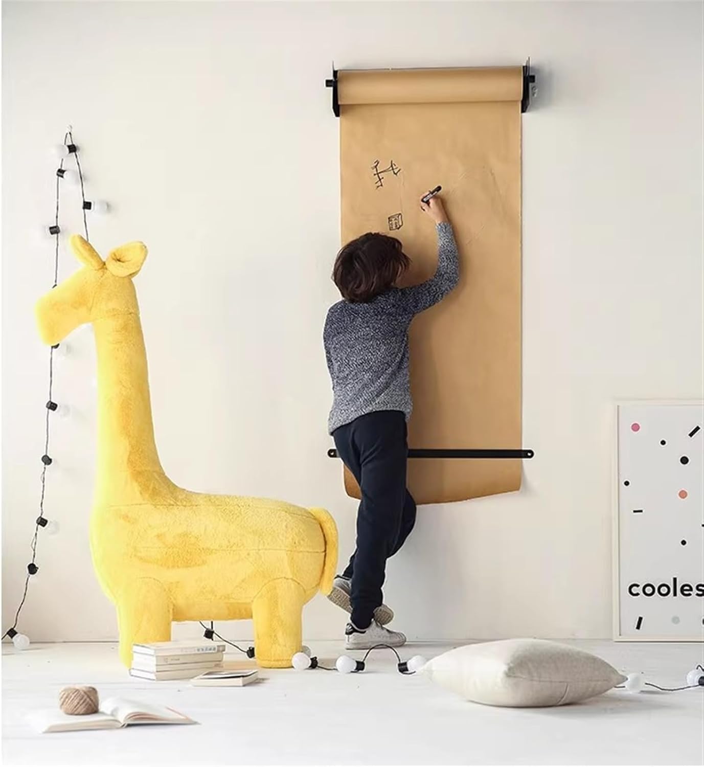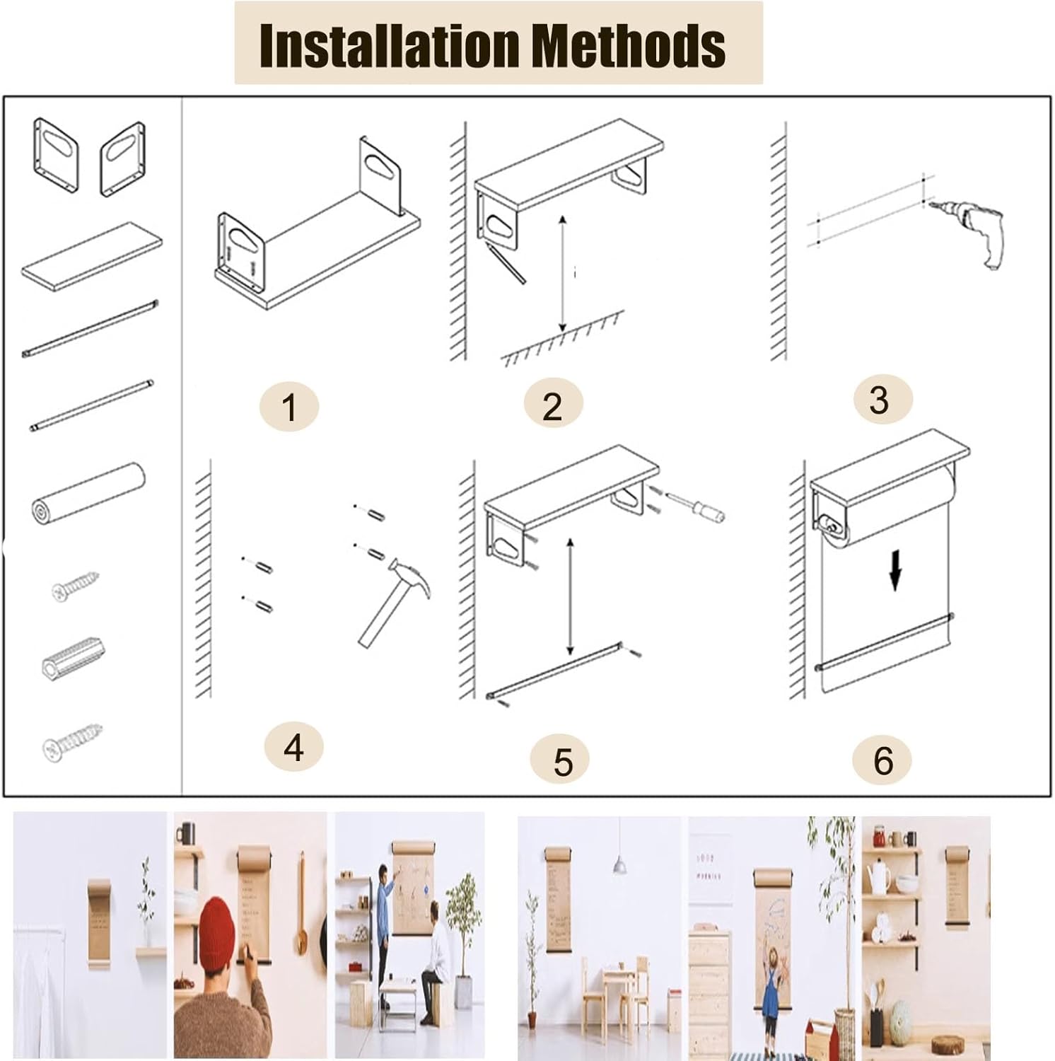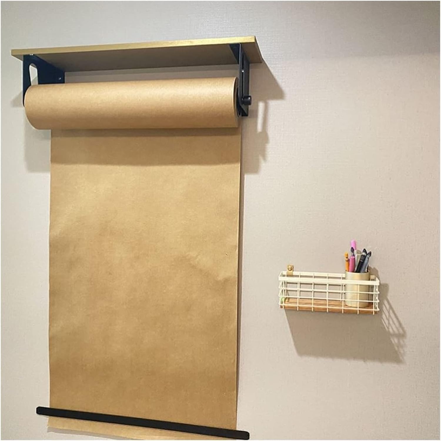 ❷Wooden shelf: Can store markers, paints and other samll tools, and putting green plants to decorate the room.Includes 50m length of kraft paper. The combo of butcher paper wood is lovely on this wall mounted paper roll dispenser.